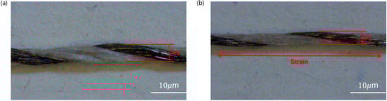 Furthermore, this change in resistance arises as the tension in the conductive thread increases, causing the spacing between the threads to narrow []. As the angle of the conductive thread increases [], the resistance also increases, resulting in higher resistance values for curved stitch patterns compared to linear ones. As shown in Figure 9, part (a) illustrates the initial thread width , while part (b) shows the reduced thread width  under tensile deformation. The difference,  , becomes larger when the stitch includes a curved geometry. Consequently, greater resistance changes are observed in stitch patterns with larger curvature.