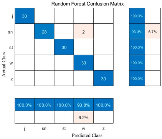 To quantitatively validate the class separability, a Random Forest classifier was applied, and the resulting confusion matrix is presented in Figure 13. The model achieved perfect classification accuracy (100%) for the j, st, w, and z classes. For the sn class, two out of thirty samples were misclassified as w, resulting in an accuracy of 93.3%. Overall, the classifier exhibited excellent performance, with minimal misclassification, confirming that the conductivity-based features are sufficiently discriminative for identifying stitch patterns.