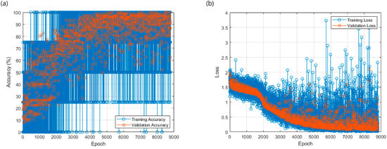 In addition to deep learning, classification performance was assessed using principal component analysis (PCA), and confusion matrices derived from a random forest classifier. S-CNN’s classification accuracy, loss values, and confusion matrix were also evaluated. All computations were carried out in MATLAB 2023a (MathWorks Inc., Natick, MA, USA). For each stitch pattern, 5800 data samples were prepared, and the dataset was divided into training, validation, and test sets at a ratio of 7:1.5:1.5. The learning rate was set to 0.001, the mini-batch size to 4, and the number of epochs to 100.