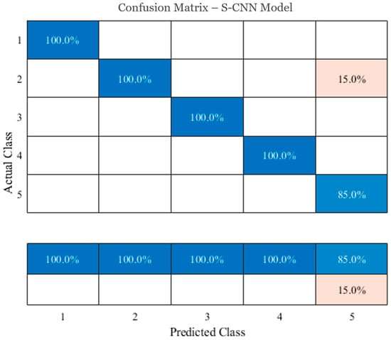 The classification accuracy and loss values obtained through training are presented in Figure 14. Figure 14a shows the training and validation accuracy over epochs, while Figure 14b illustrates the corresponding training and validation loss curves. The final classification results are summarized in the confusion matrix shown in Figure 15. The overall test accuracy achieved by the model was 97.33%. The validation accuracy was 96.10%, while the test dataset achieved an even higher accuracy, demonstrating that the model was not overfitting and exhibited stable generalization performance. Moreover, an error rate below 3% suggests that further improvements may be attainable through data augmentation or deeper network architectures. Nevertheless, an accuracy of approximately 97% already provides strong evidence of the model’s high performance, thereby confirming its reliability.