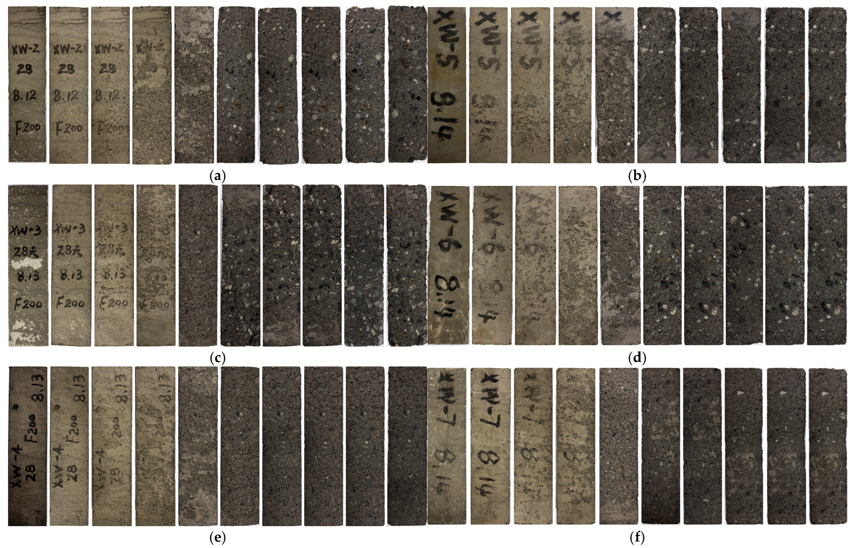 16] investigated the enhancement effect of BF on concrete frost resistance. The results indicated that adding an appropriate amount of BF can significantly enhance concrete frost resistance and mitigate F-T damage: after 150 F-T cycles, the relative dynamic elastic modulus (RDEM, a key indicator reflecting the integrity of concrete’s internal structure, A detailed description of RDEM can be found in