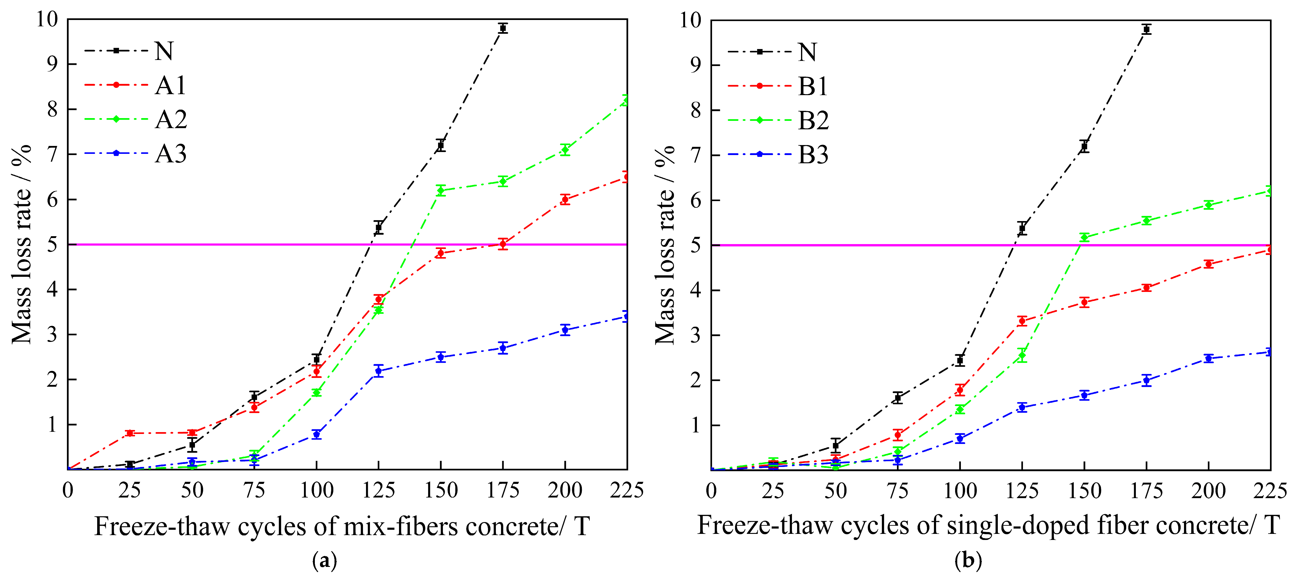 Therefore, within the scope of this study, fiber concrete with 0.3% volume content of single-doped 18 mm BF exhibits the optimal frost resistance.