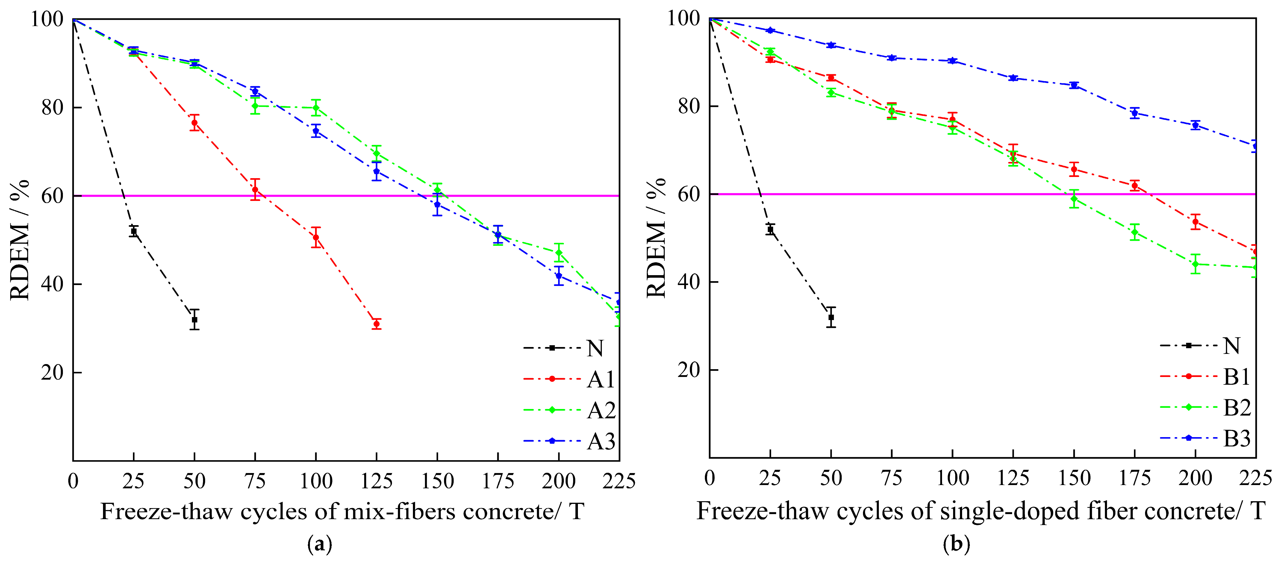 Within the concrete, at the same fiber content, a shorter fiber length results in a larger number of fibers, which are more prone to local agglomeration—potentially forming tiny “voids” in the matrix. This phenomenon may reduce local compactness and create weak points for water intrusion during F-T cycles, which could help explain why the RDEM of concrete with 0.3% volume content of mixed-doped BF decreases so rapidly. Given the absence of direct supporting data to confirm the existence of such agglomeration-induced “voids,” this explanation is proposed as a hypothesis based on the observed RDEM variation trend and the well-documented mechanism of fiber dispersion in fiber-reinforced concrete.