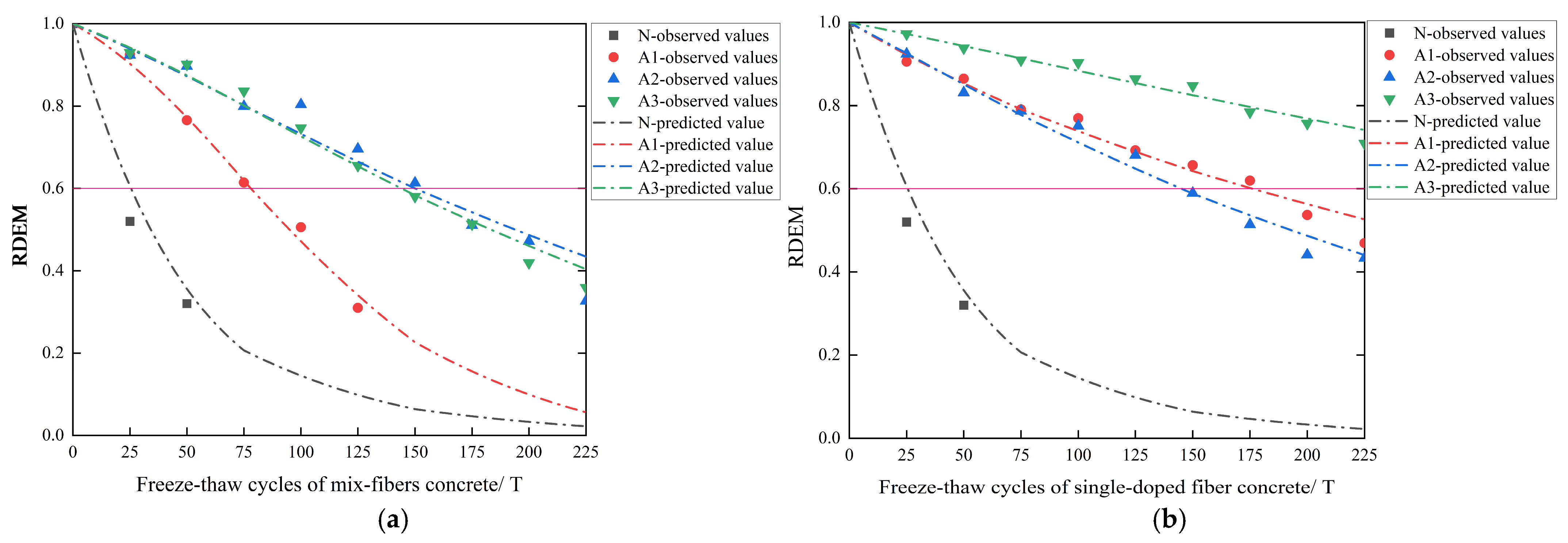 It should be noted that this formula predicts the RDEM of concrete after F-T damage. When there is no F-T damage, , n = 0, which satisfies the solution of Equation (7) but does not meet the parameter requirements of Equations (8) and (9).