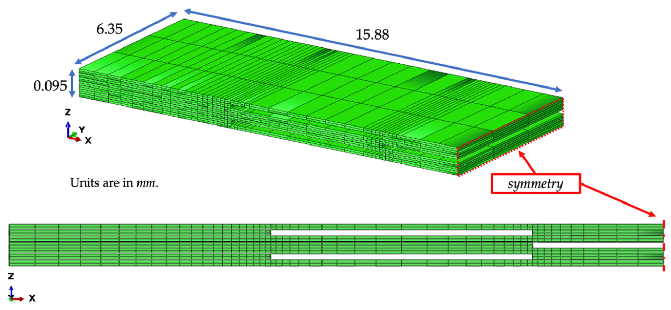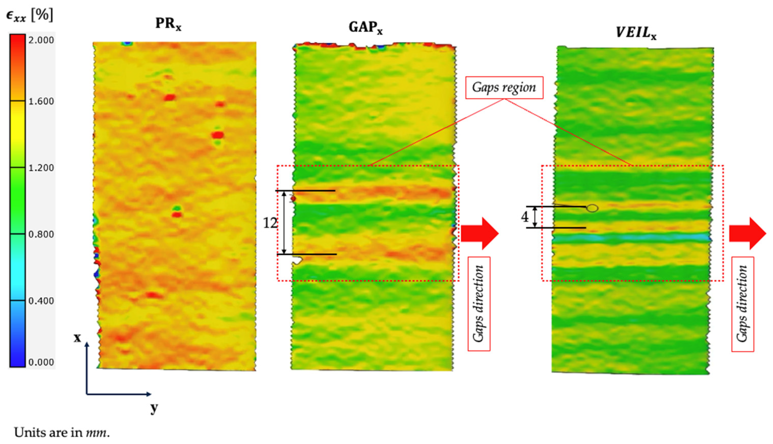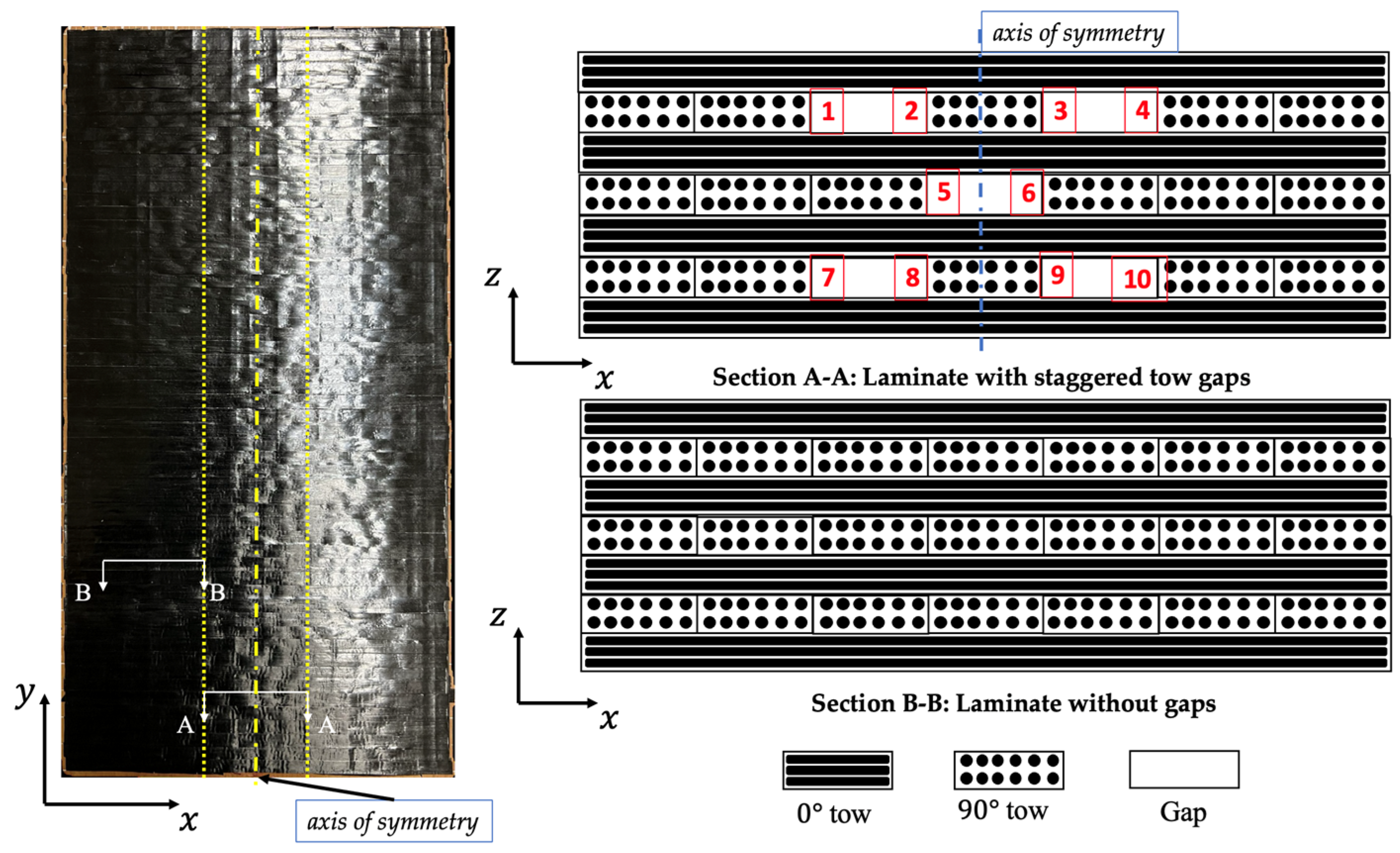 - Jamora, V.C.C.; Kravchenko, O.; Kravchenko, S. Process Modeling of a Multidirectional Laminate with Multiple Embedded Staggered Tow-gaps. In Proceedings of the AIAA SCITECH 2023 Forum, National Harbor, MD, USA, 23–27 January 2023; American Institute of Aeronautics and Astronautics: National Harbor, MD, USA, 2023. [Google Scholar]