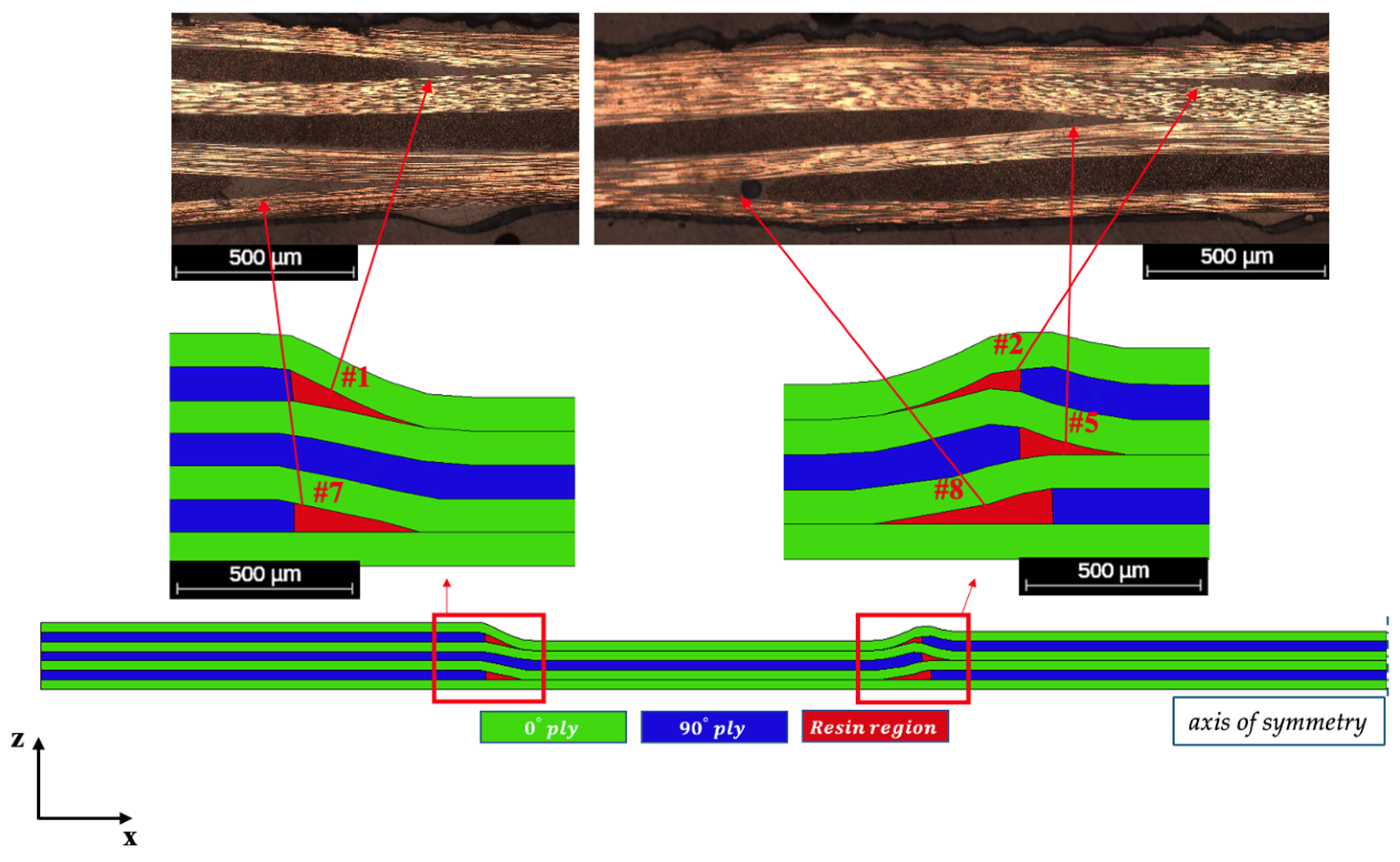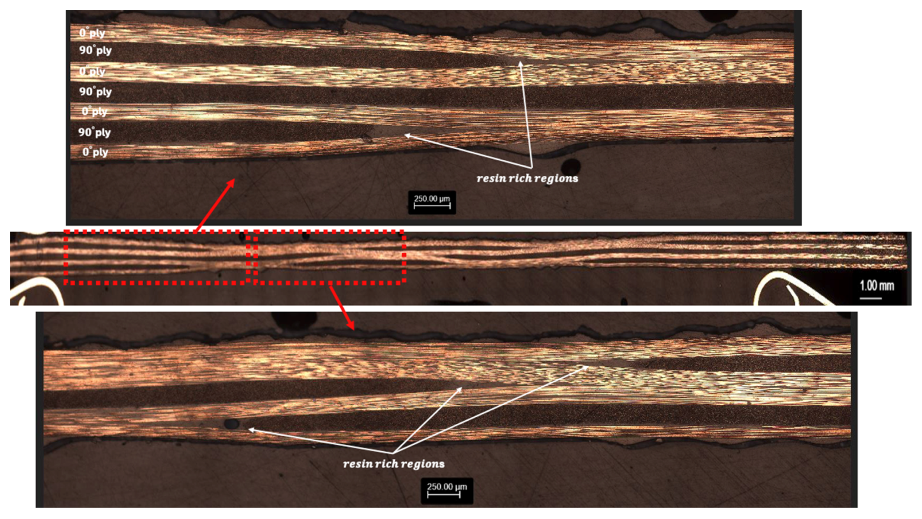 - Ghayoor, H.; Marsden, C.C.; Hoa, S.V.; Melro, A.R. Numerical Analysis of Resin-Rich Areas and Their Effects on Failure Initiation of Composites. Compos. Part A Appl. Sci. Manuf. 2019, 117, 125–133. [Google Scholar] [CrossRef]