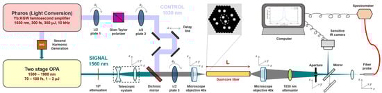 The experimental setup has already been presented in detail in [32], and its schematics are reported in Figure 1. It consists of two arms devoted to two femtosecond pulse sequences with different wavelengths generated at a 10 kHz repetition rate, labeled as follows: