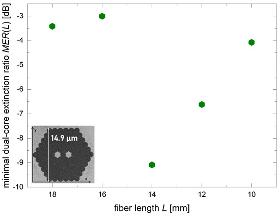 The experimental setup and data acquisition process was the same as that described in the previous section. Figure 8 shows the dependence of MER on the fiber length, L, for the second-generation DCF under fiber length reduction by cutting back from 30 mm to 14 mm. In contrast to the results obtained for the FG-DCF (presented in Figure 2), in this case, MER is negative only at three fiber lengths (at 24, 22, and 18 mm), revealing that the switching does not take place across the entire length range analyzed. The extreme MER value of −8.7 dB was obtained at the fiber length of 22 mm, which is comparable to the −9.1 dB obtained for the 14 mm FG-DCF (Figure 2). As confirmed through our numerical simulations considering artificially symmetric structures, the length difference is caused by a slightly larger distance between the core centers in the SG-DCF (3.3 vs. 3.2 µm), which leads to an elongation of the coupling length [33].