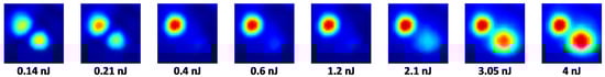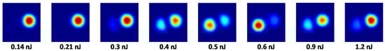 Infrared camera images of the output field of the 1560 nm, 75 fs signal pulse at 14 mm DCF with cross section as shown in Figure 2, under increasing energy of 1030 nm, 270 fs control pulse.