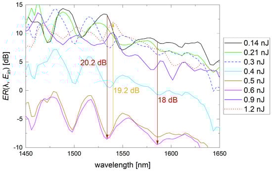 Spectrally resolved DC extinction ratio, , measured in the same experimental conditions and at the same energy levels as in the case of camera registrations presented in Figure 3 (first generation DCF). The three arrows indicate the selected wavelengths with extreme switching contrast: 1534 nm/20.2 dB and 1585 nm/18 dB between energy values 0.14–0.6 nJ (cross-switching) and 1540 nm/19.2 dB between 0.6–1.2 nJ (reversal switching).