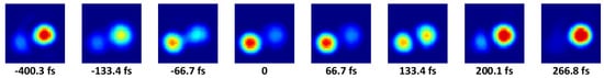 Figure 5 reports the images collected at different delays. The optimal delay point at which the energy dependence was recorded (Figure 3) is marked as 0, and the new image series was collected in the range of : (−400.3–333.6 fs). We again observed a reversal exchange of the dominant core: (i) the top (excited) core to the bottom (cross) one between −400.3 and 0 fs; (ii) reversal switching from the bottom to top cores between 0 and 266.8 fs. Figure 6 illustrates the dependence on the delay constructed via the processing of the camera images, which reveals a monotonic increase in with an increasing absolute value of the delay. Due to the instantaneous character of Kerr nonlinearity, the most efficient transfer to the cross core, with an of −7 dB, occurred at 0 delay. This represents the initial delay, ensuring the maximal cumulative overlap between the control and signal pulses during co-propagation and resulting in a maximal signal pulse cross-transfer. The delay dependence is slightly asymmetric, expressing higher DC extinction ratios with a positive . This observation suggests that the self-steepening process degraded the control pulse, leading to a steeper change in the extinction ratio at positive delays.