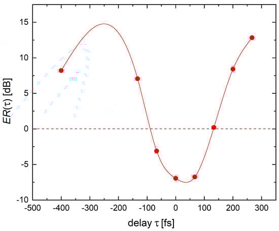 Dependence of the as a function of the control pulse delay in the range of (−400.3–333.6 fs) in the case of DCF with length 14 mm under excitation by 1030 nm, 270 fs control pulses with 0.6 nJ energy. The solid red line is a guide to the eye, obtained by interpolating the discrete experimental points using a predictive model to facilitate readability.