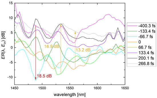 Spectrally resolved extinction ratio obtained from processing the output spectra measured at delays at 0.6 nJ energy in the same experimental conditions as in the case of the camera registrations presented in Figure 5 and Figure 6. The three arrows indicate the selected wavelengths with extreme SC: 1488 nm/18.5 dB between −400.3 and −66.7 fs (first switch), 1534 nm/16.9 dB between 66.7 and 266.8 fs, and 1560 nm/13.2 dB between 0 and 266.8 fs (back switch).