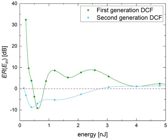 Dependence of the as a function of the control pulse energy in the range of 0.14–5 nJ in the cases of FG- (green points) and SG- (blue points) DCF with optimal lengths 14 and 22 mm, respectively. The solid lines connecting the experimental points are obtained via interpolation using a predictive model to highlight trends and improve visualization.