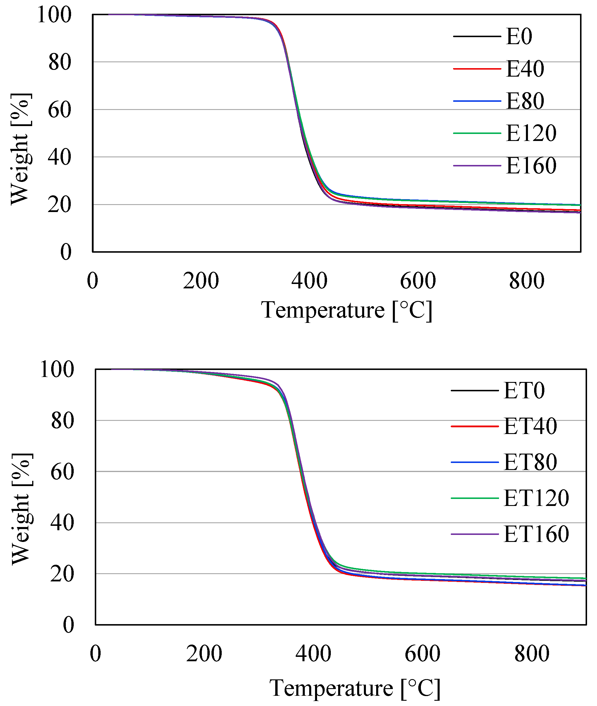 | Sample | T1% [°C] | T2% [°C] | T5% [°C] | T10% [°C] | Tmax. [°C] |
