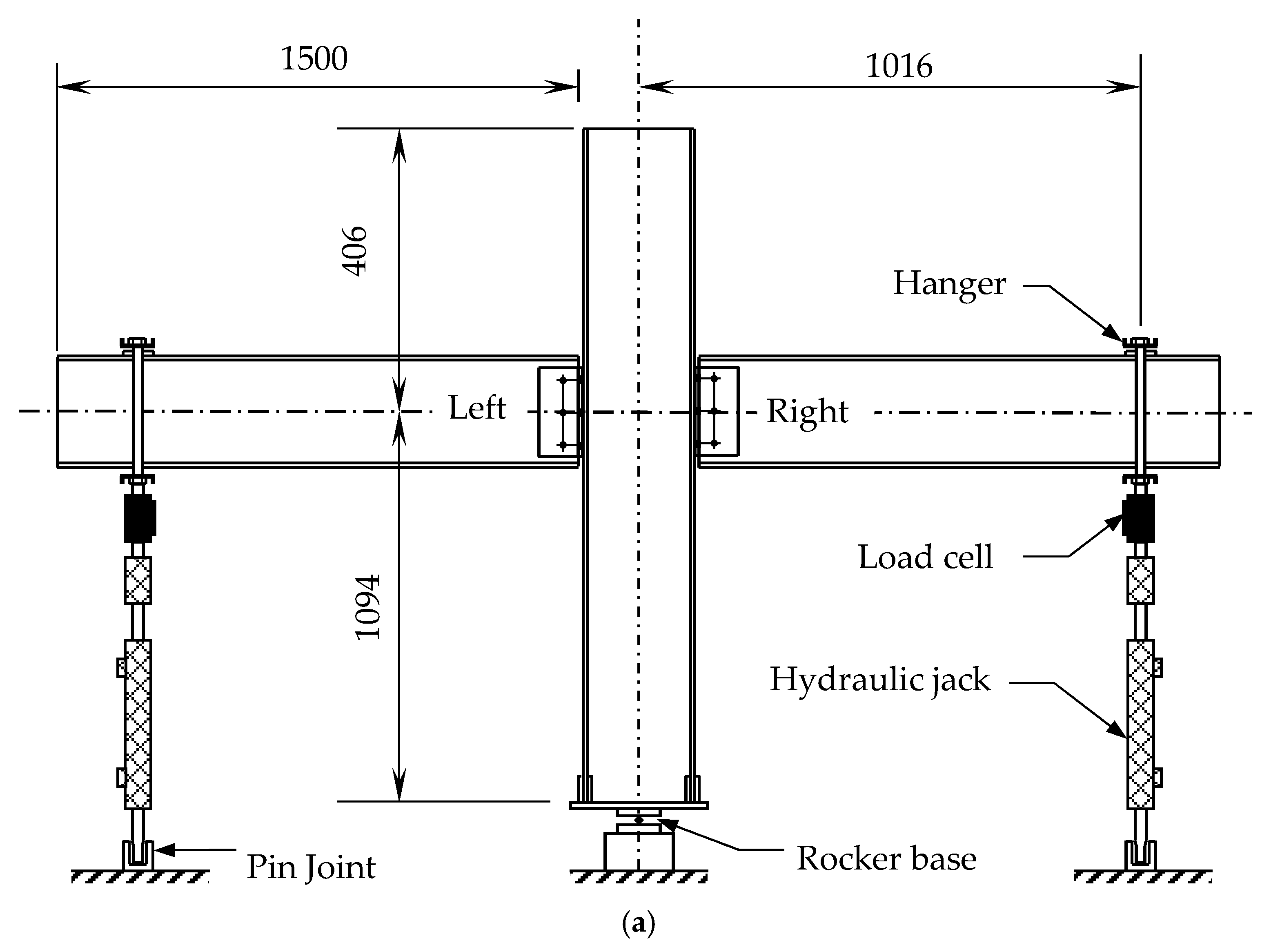 Both the beams and the column are 1500 mm long and consist of wide flange (WF) sections with dimensions of 254 × 254 × 9.53 mm. The web cleats, 192 mm in height, are cut from an equal angle. The connection incorporates an equal-leg angle web cleat with dimensions of 100 × 100 × 9.53 mm, where the leg lengths are 100 mm each and the thickness is 9.53 mm. The reinforcement in the cleats is aligned with the direction of the applied shear force. The reinforcement in the cleats refers to the unidirectional glass fibres embedded within the pultruded GFRP material, which are aligned parallel to the leg length of the cleats to replicate the actual manufacturing orientation. The beam centreline is positioned 1094 mm above the base of the column. The column base rests on a steel rocker fixture that permits in-plane rotation, justifying the assumption of a pinned connection. This pinned support ensures equal loading on both beams during testing. All dimensions, general arrangement of the test, and connection detailing are presented in