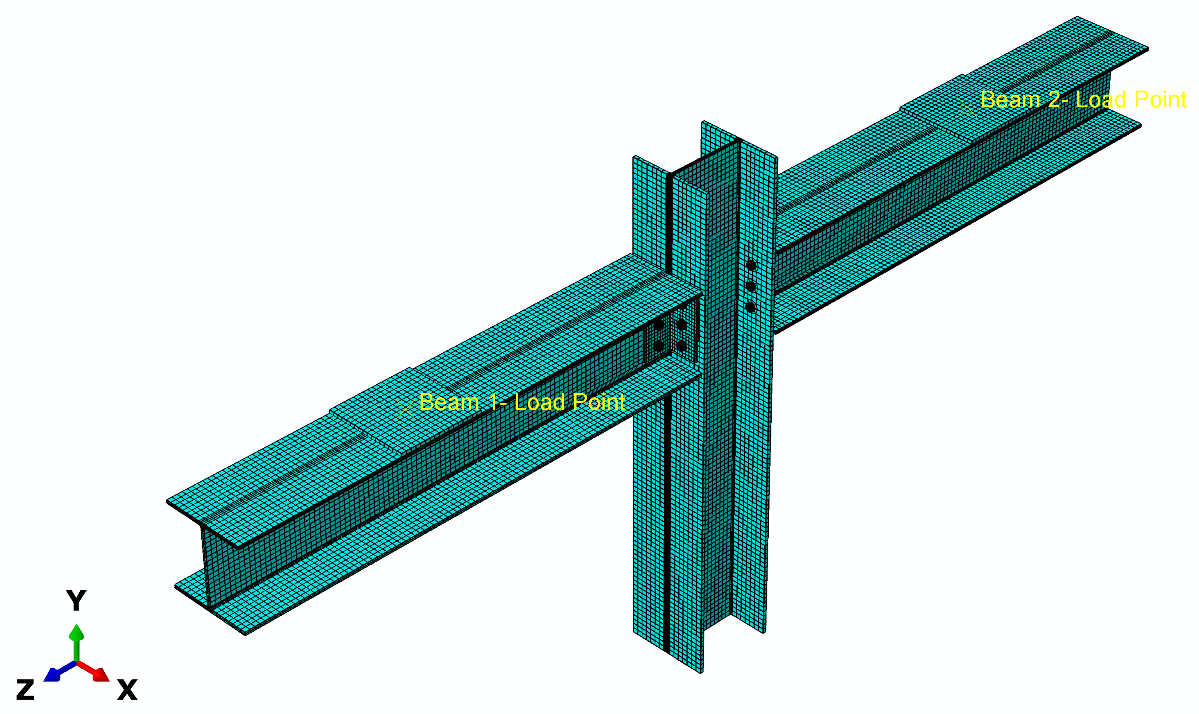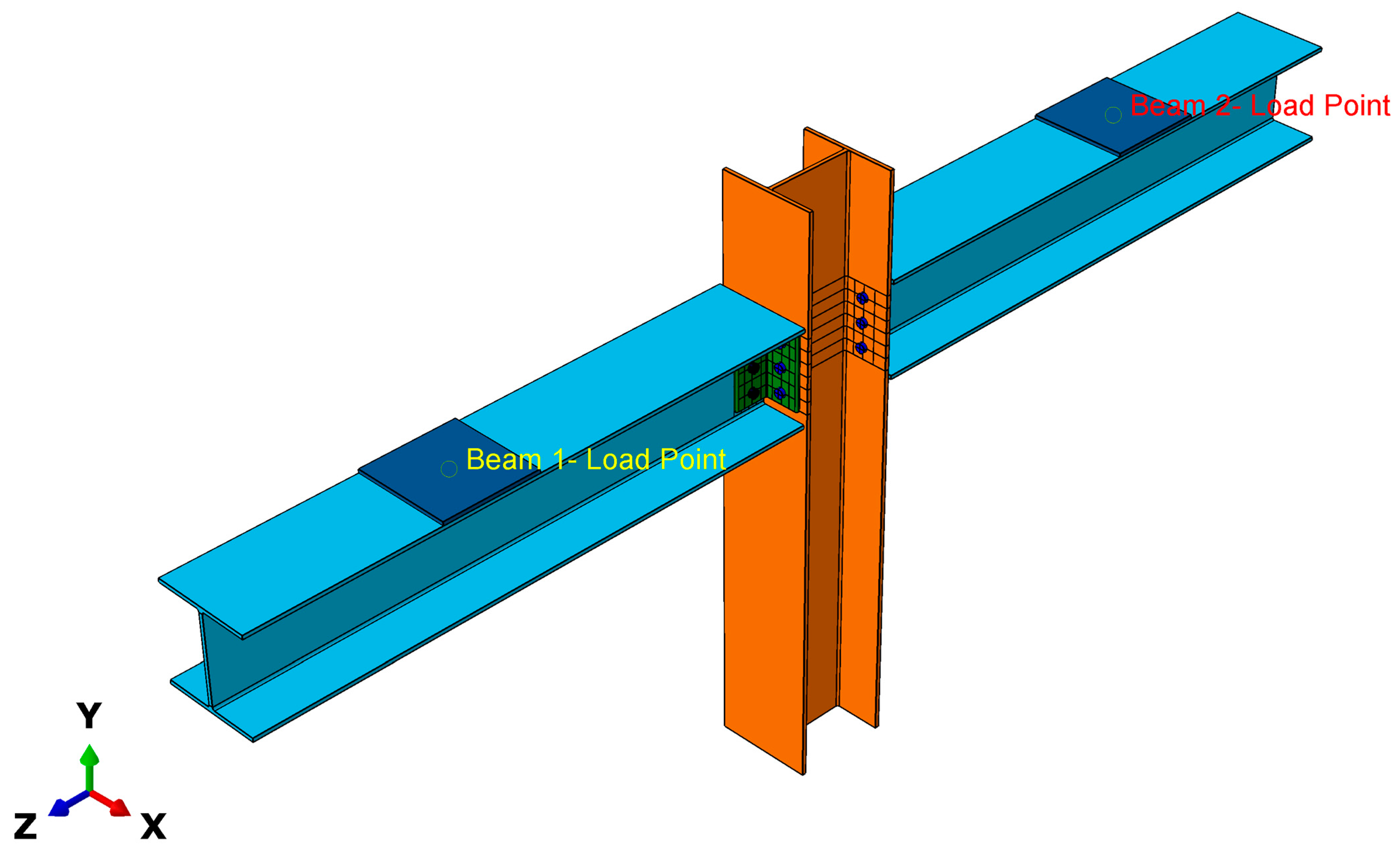 Loading was applied simultaneously to both beams as downward displacements in the negative y-direction, replicating the experimental setup. Reference points were defined at the loading locations to control displacement and rotation. A vertical displacement of −50 mm was applied incrementally at each loading point to simulate the experimental loading sequence and capture the non-linear response of the joint.