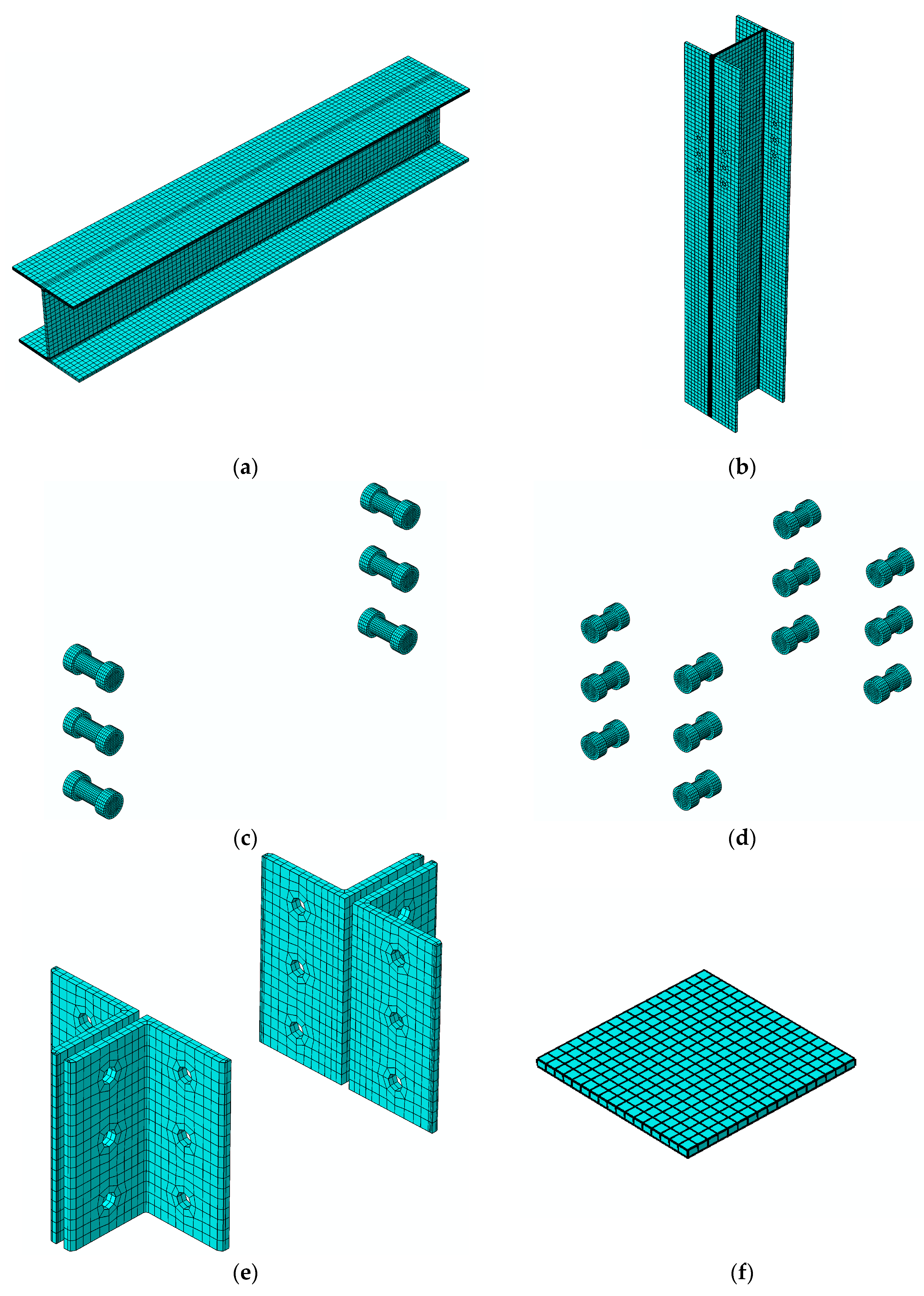 The GFRP beams were meshed with an element size of 15 × 15 mm, except at the web–flange junctions, where a finer mesh of 5 × 5 mm was applied. Each beam contained 7224 elements and 21,980 nodes. For two cantilever beams, this resulted in 14,448 elements and 43,960 nodes. Web cleats were meshed with 15 × 15 mm elements, except at the fillet radius (5 mm). Each cleat had 3004 elements and 9658 nodes; four cleats were used in total, giving 12,016 elements. Web bolts were meshed with a 2 mm size, producing 2944 elements per bolt. With six web bolts, the total was 17,664 elements. Flange bolts were meshed with the same 2 mm size, giving 2480 elements per bolt. With twelve flange bolts, this resulted in 29,760 elements. Each loading plate, meshed with 15 × 15 mm elements and 1 mm depth, contained 289 elements, giving 598 elements for both plates. In total, the complete model contained 81,712 elements. All meshed parts are shown in