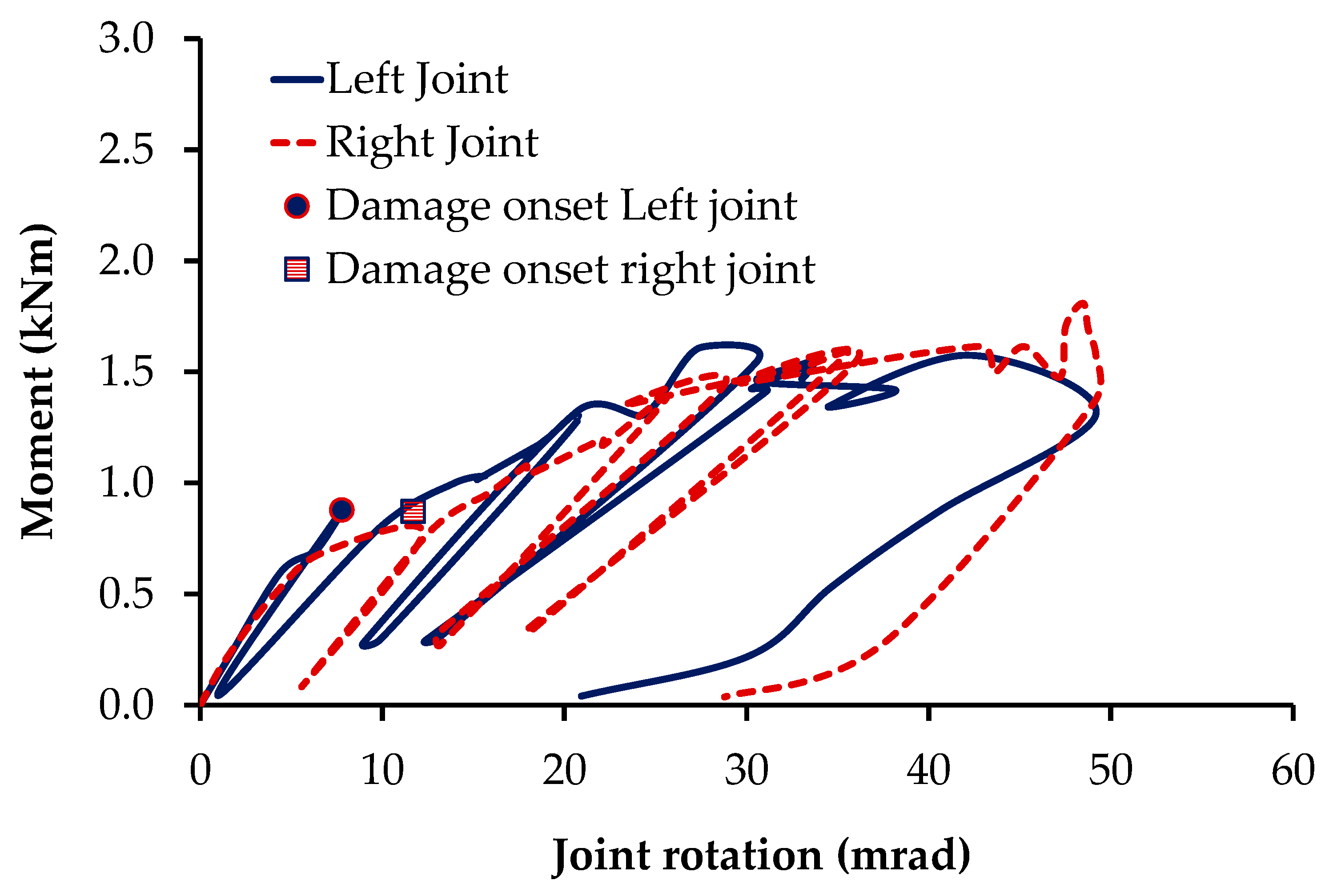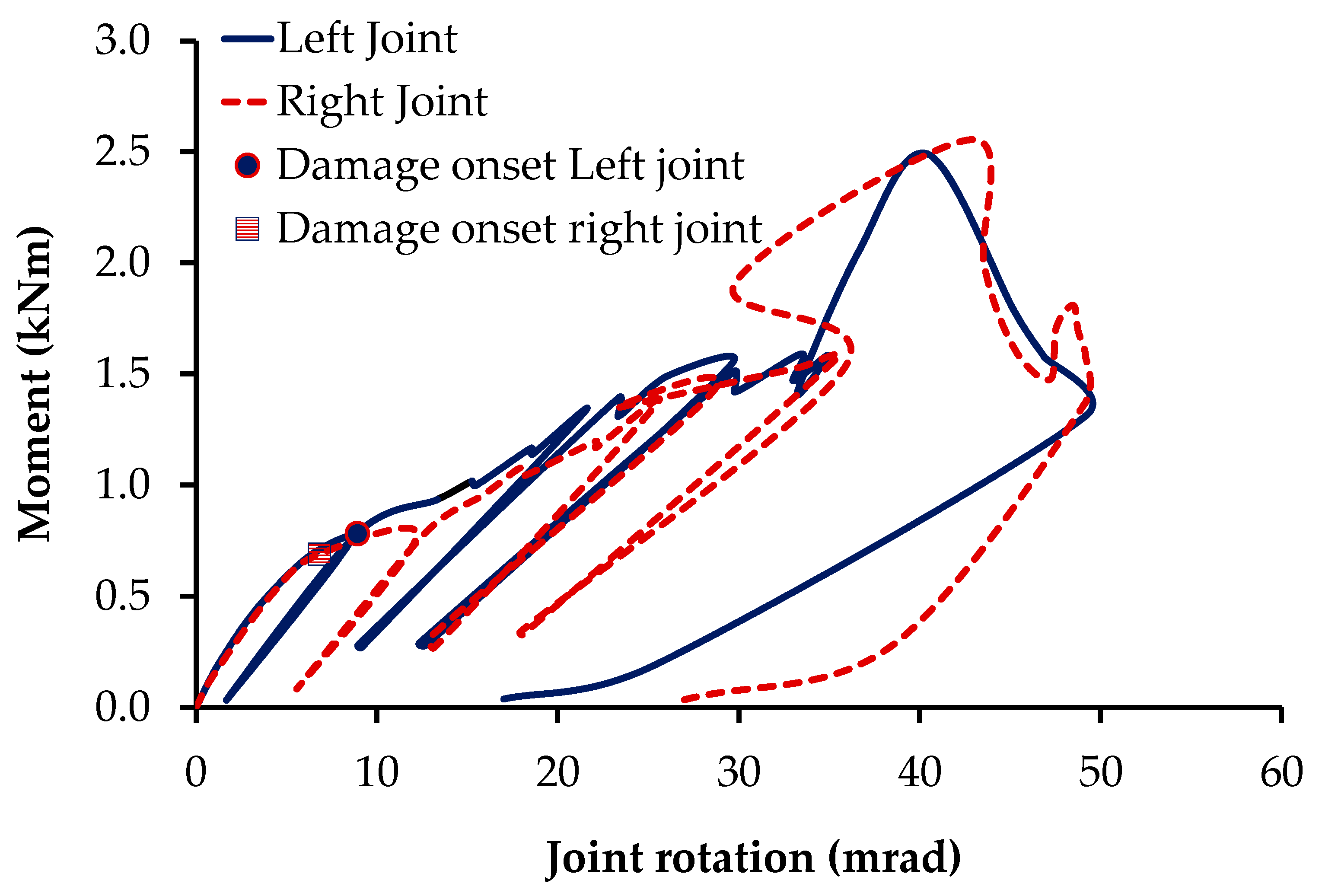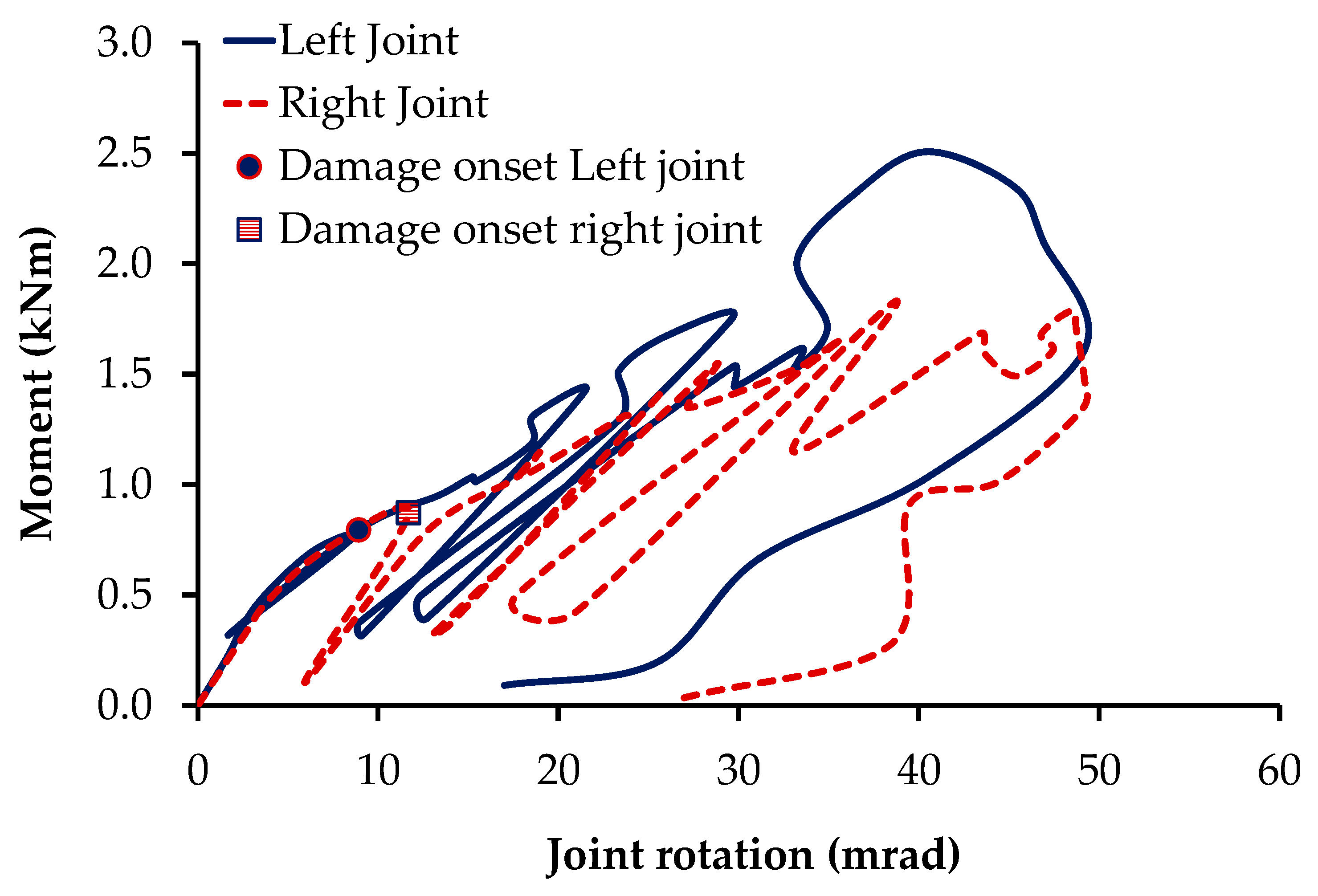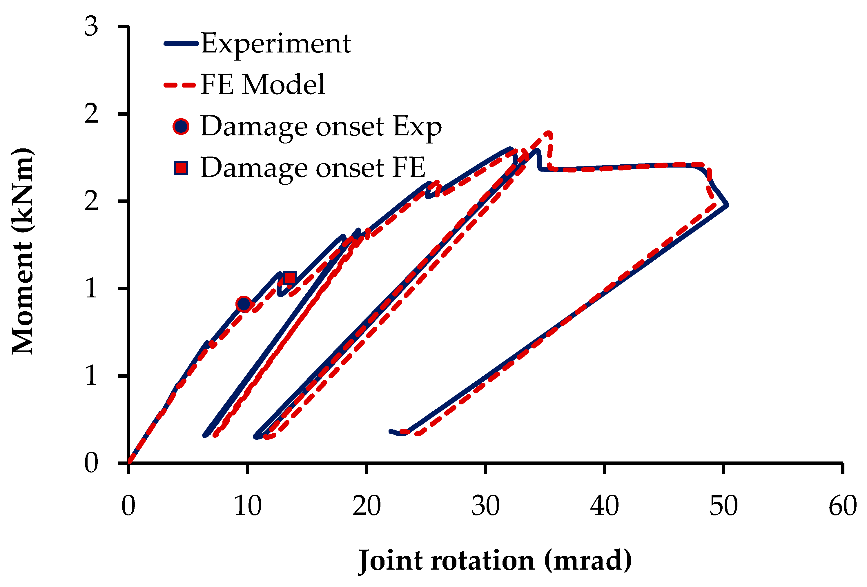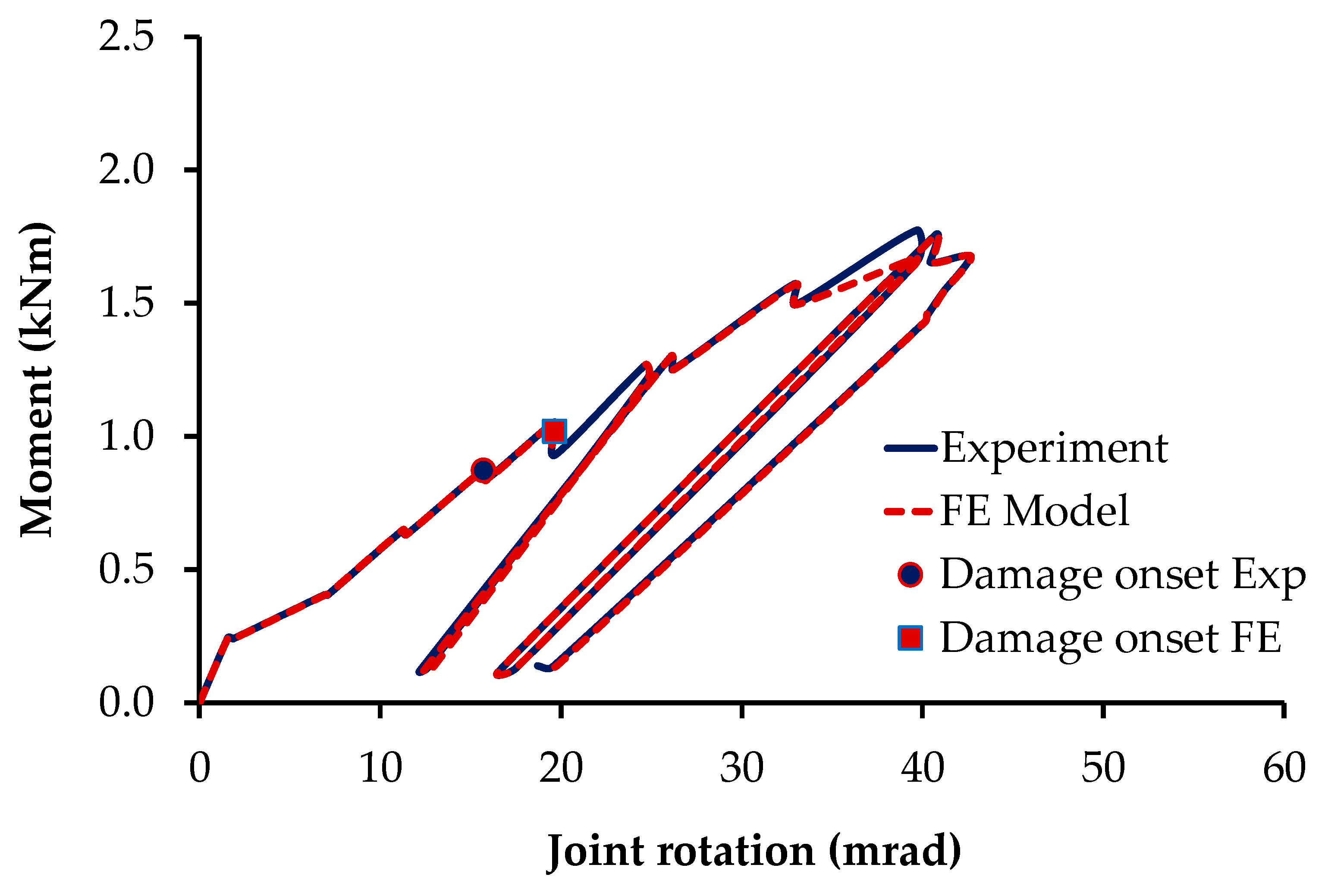 The right-hand curve illustrates the maximum moment capacity as approximately 1.80 kNm for both the numerical and experimental results. When comparing the maximum rotation, the numerical value of 49.17 mrad shows a small variation from the experimental value of 50.25 mrad. The moment–rotation behaviour on both the left and right sides from the FE analysis show close agreement with the experimental results. The damage onset is shown by a circle and square symbol in