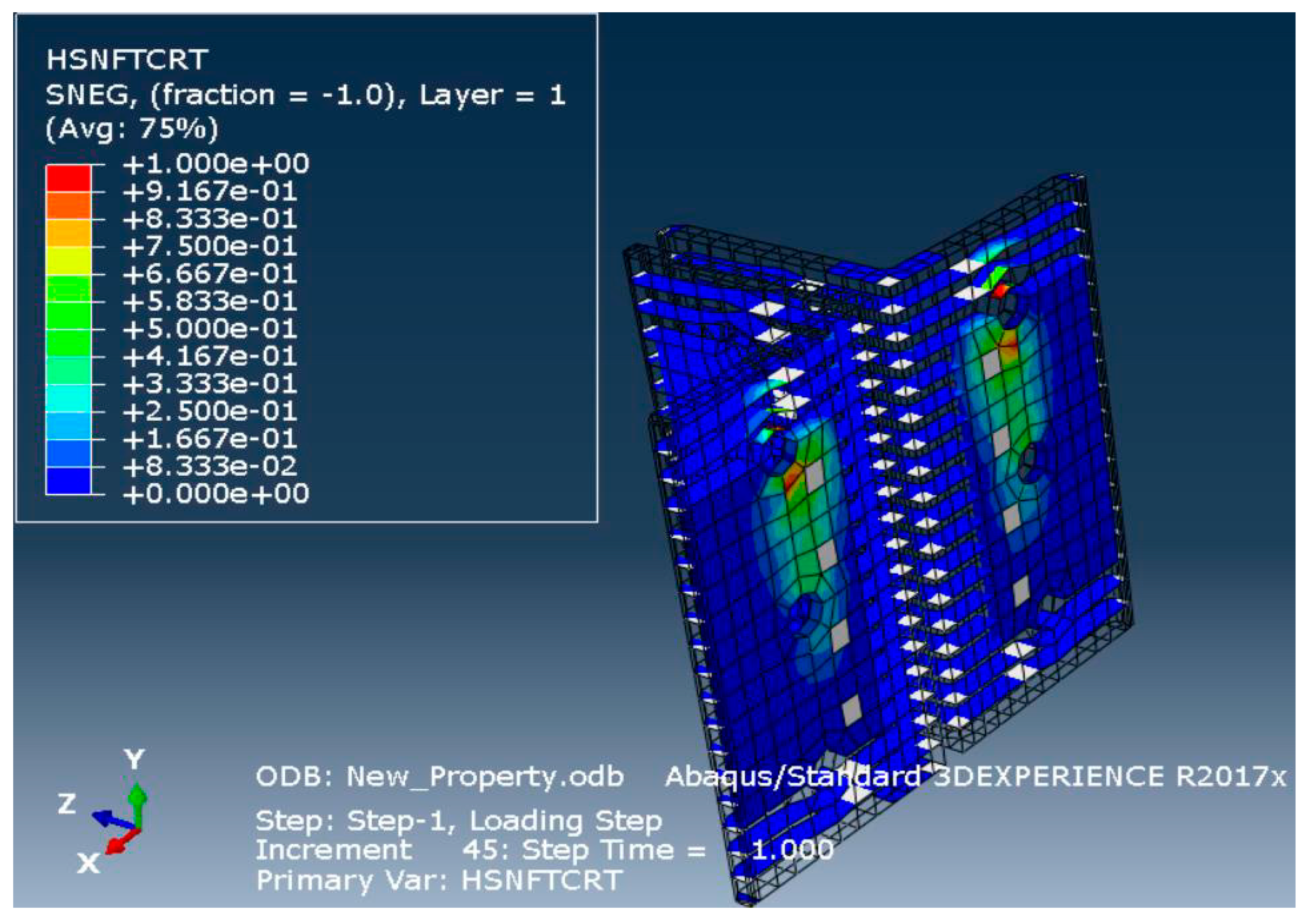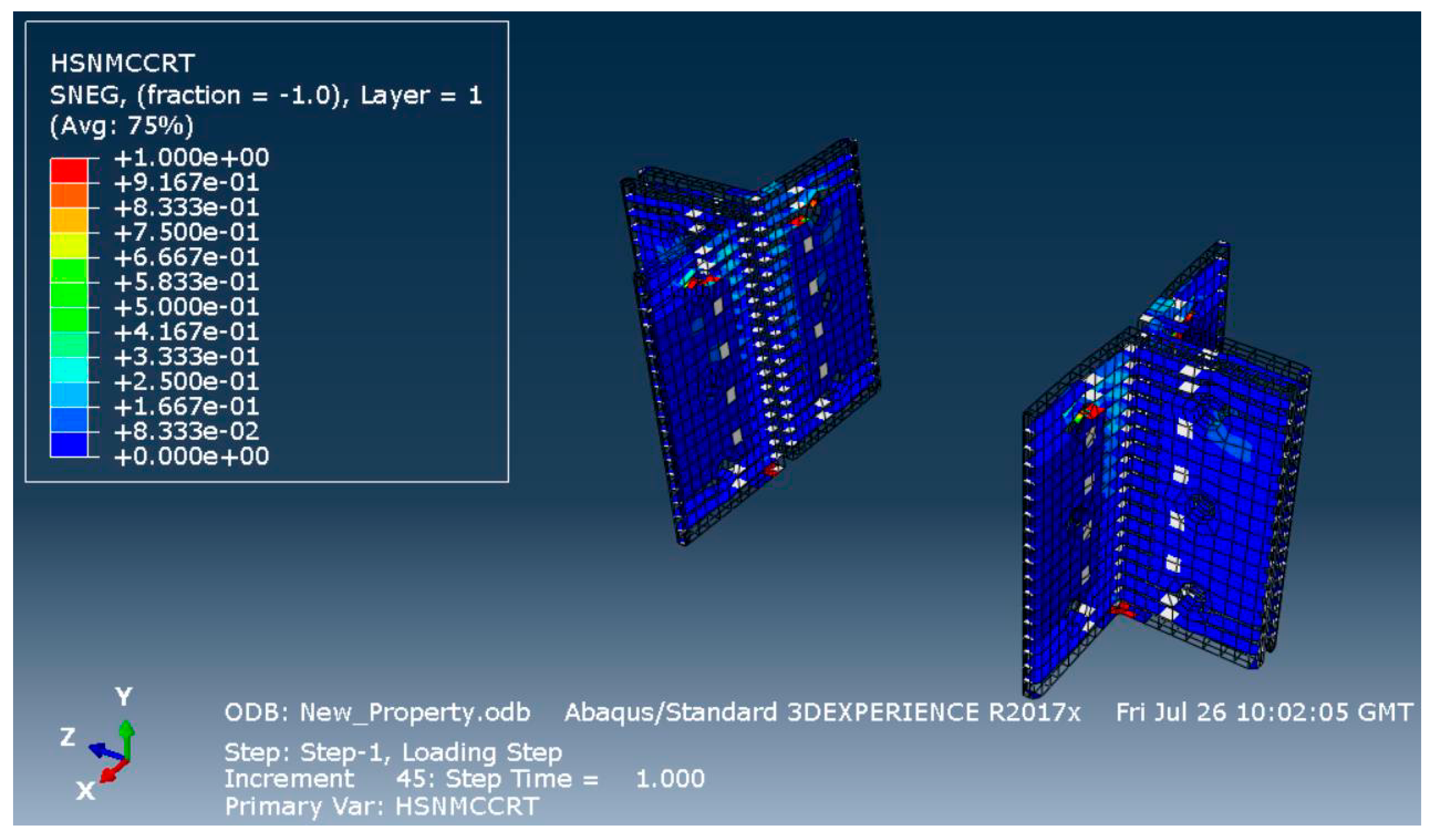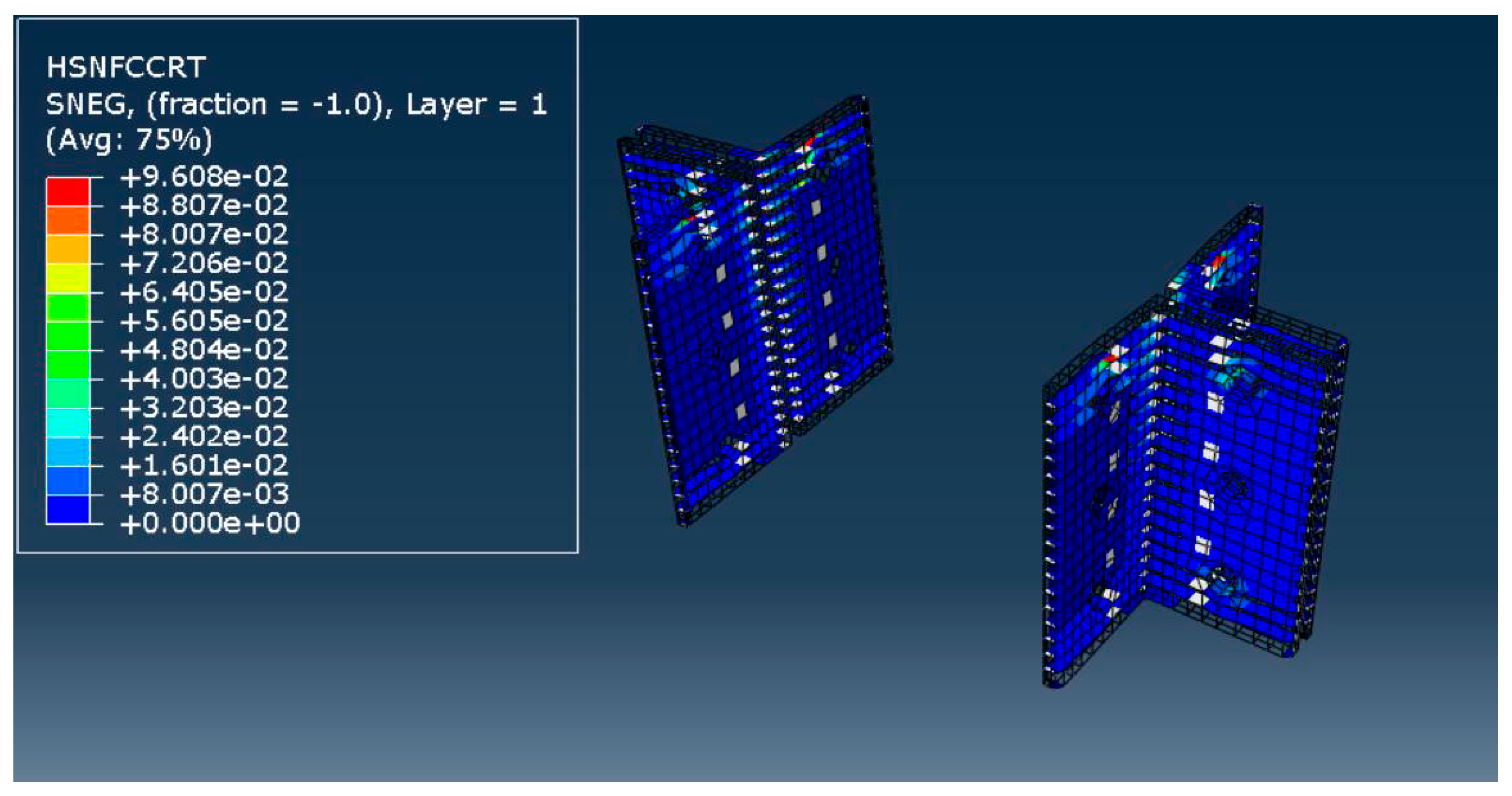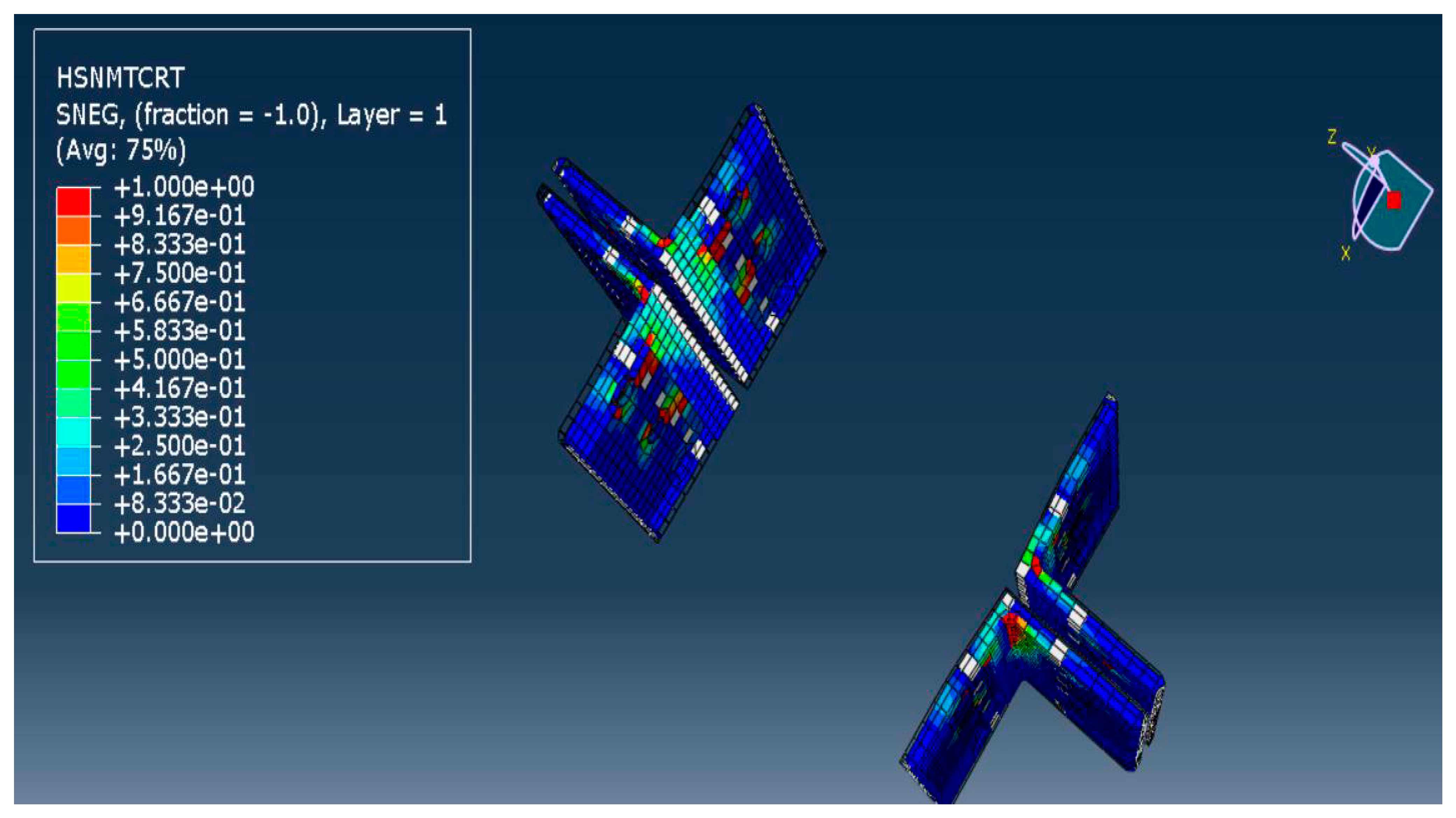 Failure modes were examined by inspecting stress and damage distributions within the web cleats. The Hashin damage outputs provided detailed insight into the initiation and propagation of fibre and matrix failures, allowing assessment of localised damage development in the joint configuration.