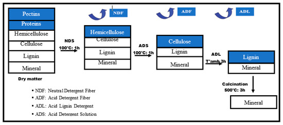 Van Soest’s dry biomass fractionation method [21,22,23] was used in this work to determine the percentage of cellulose, hemicellulose, and lignin in accordance with the French standard XP U44-162. Before testing the sample must be in powder form; to achieve this, the fibers were dried at 105 °C for 24 h in an oven, then cut, crushed, and sieved to obtain a very fine powder [21]. The constituents are determined sequentially by treatment with neutral detergent, acid, and sulfuric acid.