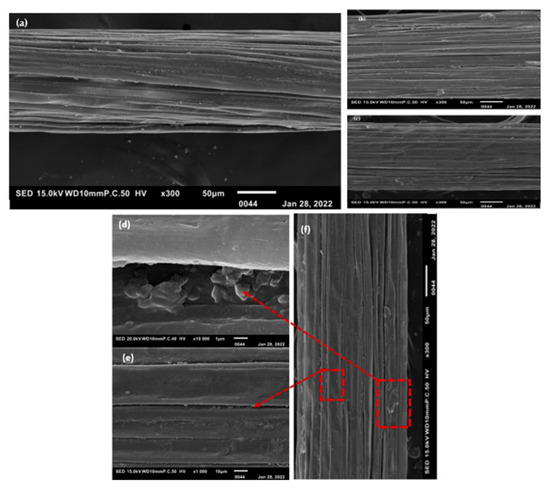 SEM images of longitudinal views of three extraction methods: (a) WR; (b) DR; (c) ME; (d) pectins; (e) bundle banana; and (f) expansion of fibers [16].
