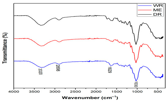 Figure 4 and Table 3 show, respectively, the spectra and FTIR vibration bands of William banana peduncle fibers obtained by three methods, identifying the functional groups present in the molecular structure of the fibers. From the spectra of WR, DR, and ME fibers, the vibration bands observed around 3320 cm−1 are attributable to OH stretches of α-cellulose and the hydrogen-bonded cellulose structure [33]. Those located at 2898 cm−1 correspond to the C-H stretching of CH and CH2 cellulose and hemicellulose in fibers [29,34]. The peaks also observed at 1629 cm−1 are attributable to stretching of of the amides present in lignin and hemicellulose. Finally, the peaks located at 1030 cm−1 are attributed to C-OH stretching of lignin [35]. This result confirms the lignocellulosic structure of WR, DR, and ME fibers and also correlates with their chemical composition. In addition, the extraction methods do not affect the chemical composition of the extracted fibers.