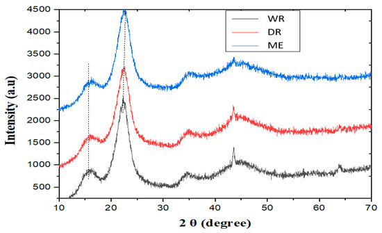 Figure 6 shows the diffractograms of the fibers extracted by the three methods. The first peaks observed at around 2θ = 16.09° correspond to the different amorphous fractions. On the other hand, the second peaks observed at around 2θ = 22.67° correspond to the crystallographic planes of the cellulose. These results are similar to those found by Belouadah et al. [40] and Dallel [41].