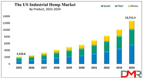 Industrial hemp (Cannabis sativa L.), also commonly referred to as hemp, has been cultivated since time immemorial and is believed to have its origin in Western Asia, spreading thenceforth [31]. The low Δ9-tetrahydrocannabinol content of industrial hemp (<0.3%) makes it nonpsychoactive, distinguishing it from other Cannabis species, namely C. indica and C. ruderalis [32]. Due to its ability to grow needless pesticides, herbicides, and fungicides as well as its wide geographical range of cultivation and diverse end products, hemp is currently being traded in international commodity markets in over 30 countries [27]. Growing up to 0.31 m in a week, hemp cultivation does not require intensive labor during its cropping cycle of approximately 70 to 90 days [33]. The total yield depends on the sowing density, nitrogen level, and harvest time [34,35,36]. Up to 12 tons of cellulose, 20 tons of stem particles, and 25 tons of fiber yields are obtainable per hectare of cultivated hemp [37]. To maintain the fiber quality in terms of fineness and strength, organic farming is the industrial norm for hemp cultivation [38]. Harvest time depends on the primary cultivation purpose, such as harvesting at the end of flowering for fiber production [38,39]. Hemp fiber cultivation requires 77.63% less cost in fertilization, seeds, field operation, and irrigation than cotton [25]. The ability of hemp to sequester carbon, produce more biomass, and provide a range of end products has made it a very successful commercial crop for various applications with an exponential market growth forecast between 2025 (USD 2143.6 million) and 2034 (USD 12,713.3 million), reflecting a compound annual growth rate of (CAGR) of 21.9% over the forecast period, as shown in Figure 1 [40]. Hemp can be grown to remediate contaminated soils through phytoremediation, hence being considered as a potential cover crop [25,37]. Even hemp leftovers have the potential to function as natural pesticides, miticides, and inhibitors of pathogenic fungi and soil nematodes [41,42]. Hemp is widely regarded as a sustainable crop because it meets the social, economic, and environmental aspects of sustainability.