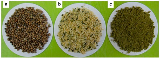 Photographs of (a) hemp seeds, (b) dehulled hemp seeds, and (c) hemp flour [58].