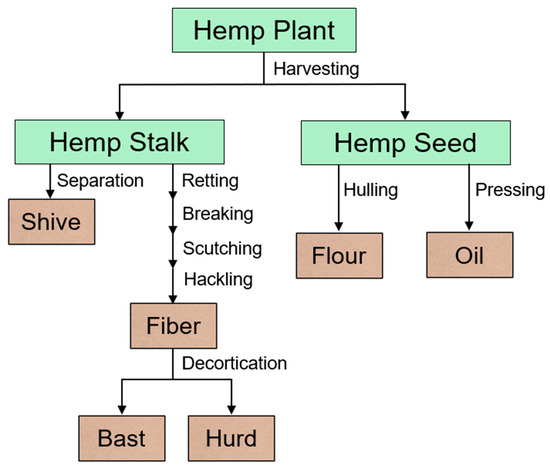 Hemp fibers typically constitute only 40–60% of the weight of hemp plant stem of the hemp plant [35]. These fibers are divided into primary fibers that are mainly used for textile production, and secondary fibers, which may be used as insulation and reinforcement in composites. Hemp fiber may consist of approximately 70–74% cellulose, 18–22% hemicellulose, 4–6% lignin, 3% ash, 1% pectin, and 1% wax [25]. A comprehensive description of the anatomy of hemp fiber is detailed in references [43,44]. The properties of hemp fiber include aseptic properties, high absorbency, UV radiation protection, and allergenic effects [25,37,45]. Hemp fibers are a cost-effective and eco-friendly alternative to glass fibers, offering good mechanical strength, high tenacity, and low elongation at break [46]. They also have high damping capacity, making them suitable for producing sports and musical instruments [47]. The cumulative energy demand of hemp fibers is 10% lower than glass fibers [48]. Hemp fibers have significant potential for sustainable biocomposites and green composites production due to their superior mechanical and eco-friendly properties compared to other fibers used as reinforcement [38]. However, harvest time, maturity, selection, and preparation of fibers are crucial for producing high-quality hemp fiber-based composites. A research study found that harvest time and maturity significantly affected the breaking point strength of hemp/epoxy composites [34]. Pretreatment of hemp fibers, such as alkalization, can improve composite quality by removing non-cellulosic impurities and increasing surface roughness [49].