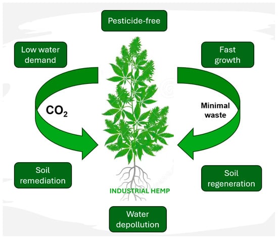 Hemp exhibits reduced ecological effects compared to other plants or raw materials [32]. It can reduce fertilizer and chemical usage, boost soil oxygenation, and be an excellent rotational crop [82]. Hemp also generates eco-friendly materials like heat-insulation and carbon-sequestering polymers [28]. The sustainability of hemp is illustrated in Figure 4, including its low water demand, no pesticide usage, fast growth, water and soil remediation, as well as its carbon sequestrating ability.
