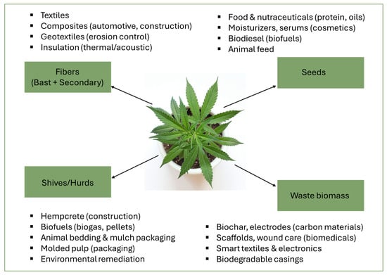 This is the woody inner core of the hemp stalk, which is versatile, sustainable, and applicable in multiple industries. In the construction sector, hemp shives are mixed with lime to produce hempcrete, a lightweight, insulating material with excellent thermal and acoustic properties. A research study demonstrated that hempcrete is not only durable but also carbon-negative, which makes it an eco-friendly alternative to traditional building materials [59]. In agriculture, hemp shives are used as a soil amendment and mulching material to improve soil aeration, water retention, and organic matter content [60]. They are also widely used as animal bedding due to their high absorbency and natural antimicrobial properties [55]. In the energy sector, hemp shives are used as feedstock for biofuel production, with studies showing their potential for producing biogas and pellets with lower greenhouse gas emissions compared to fossil fuels [61]. In addition, hemp shives are used in the paper and packaging industry to create durable and biodegradable materials, therefore reducing reliance on wood pulp and synthetic plastics. Their lightweight and porous nature also makes them ideal for composite materials in automotive and furniture industries, where they are combined with resins to produce eco-friendly alternatives to traditional plastics [38]. Additionally, lignin, a significant component of hemp shives, has been shown to reinforce biodegradable polymers like polybutylene succinate (PBS), enhancing their thermal stability and stiffness while contributing to the development of sustainable bio-based composites [62]. Finally, hemp shives have shown potential in environmental remediation, particularly for absorbing oil spills and heavy metals, offering a natural solution for cleaning up contaminated sites [55].