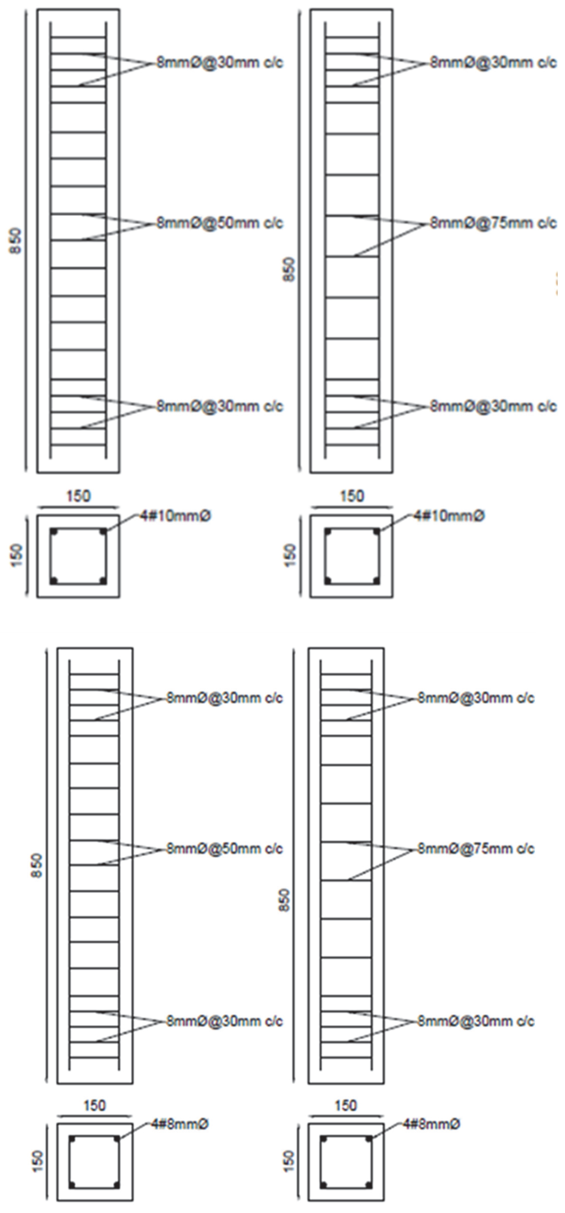 | Specimen | Number of Specimens | Type of Main Reinforcement | Main Reinforcement: Diameter of Bar (mm) | Transverse Steel Reinforcement (mm) | Spacing (mm) |