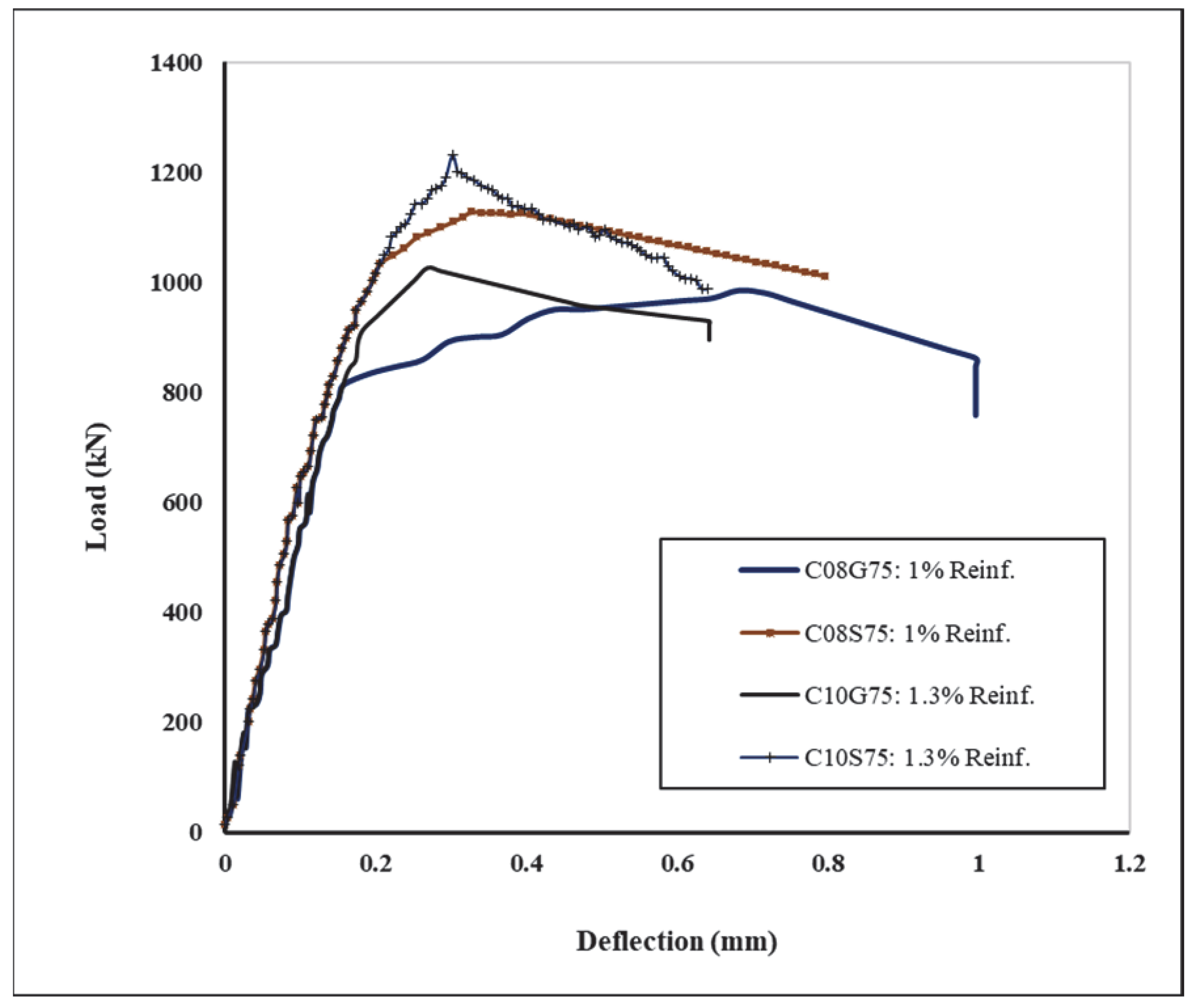 - Specimens with a spacing of 75 mm (7db) and a reinforcement ratio of 1.3%