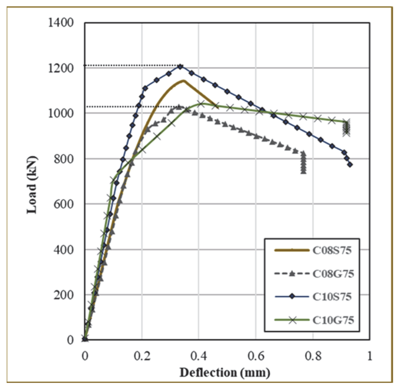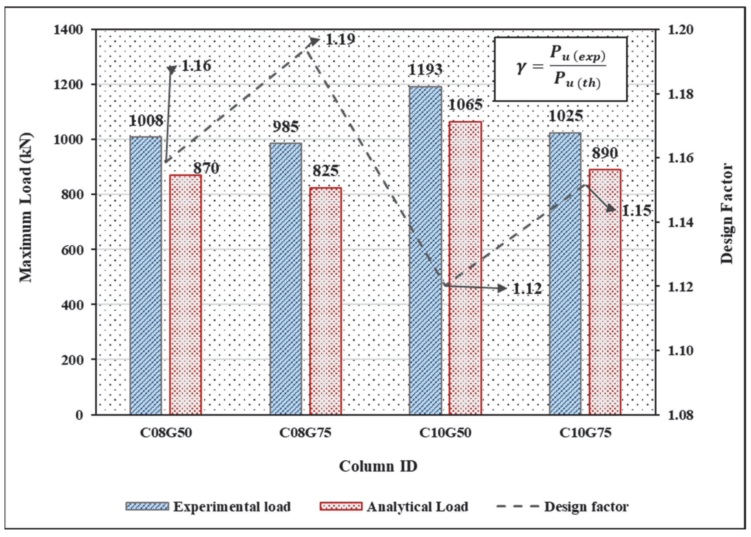 - Load capacity of GFRP-RC columns achieved 85–90% of the load carrying capacity of the steel-reinforced column, with the contribution of GFRP bars of 10–12% of total axial load capacity.