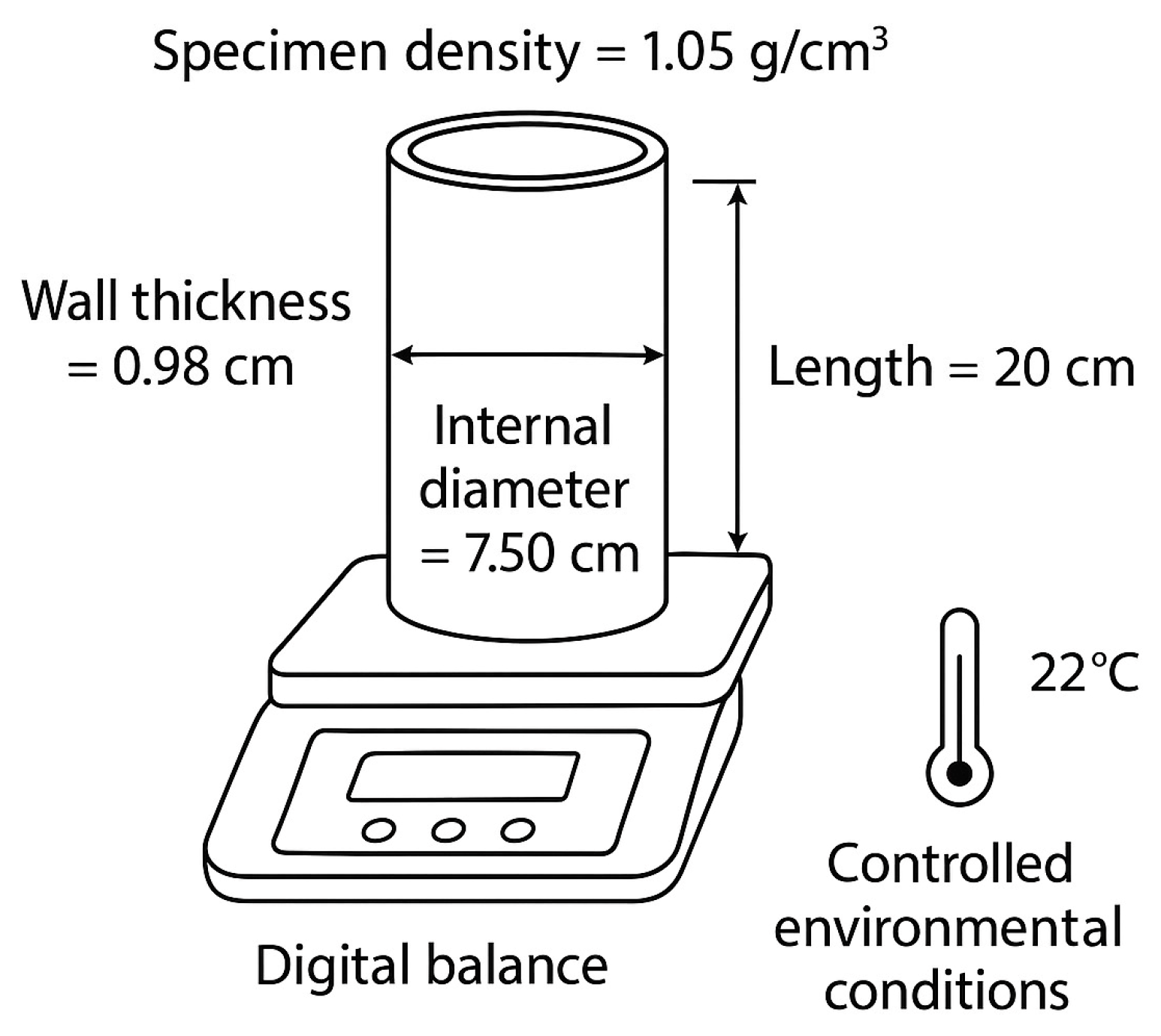- Flight Simulation—OpenRocket v15.03 [33], an open-source simulation software, was used to compare fiberglass and jute rockets. All rocket components (motor, avionics, recovery, fins, nose cone, and internal structures) were kept constant, with only the fuselage material modified. The densities of each laminated fuselage were determined experimentally using a direct mass-to-volume ratio (Figure 7) based on the cylindrical geometry of the specimens after 48 h of curing under controlled environmental conditions (22 °C and 86% RH). This ensured realistic input parameters for OpenRocket simulations. The jute density used in the simulation was 1.037 g/cm3, a value similar to polystyrene. Aerodynamic properties and surface roughness were integrated into the models (Figure 8).