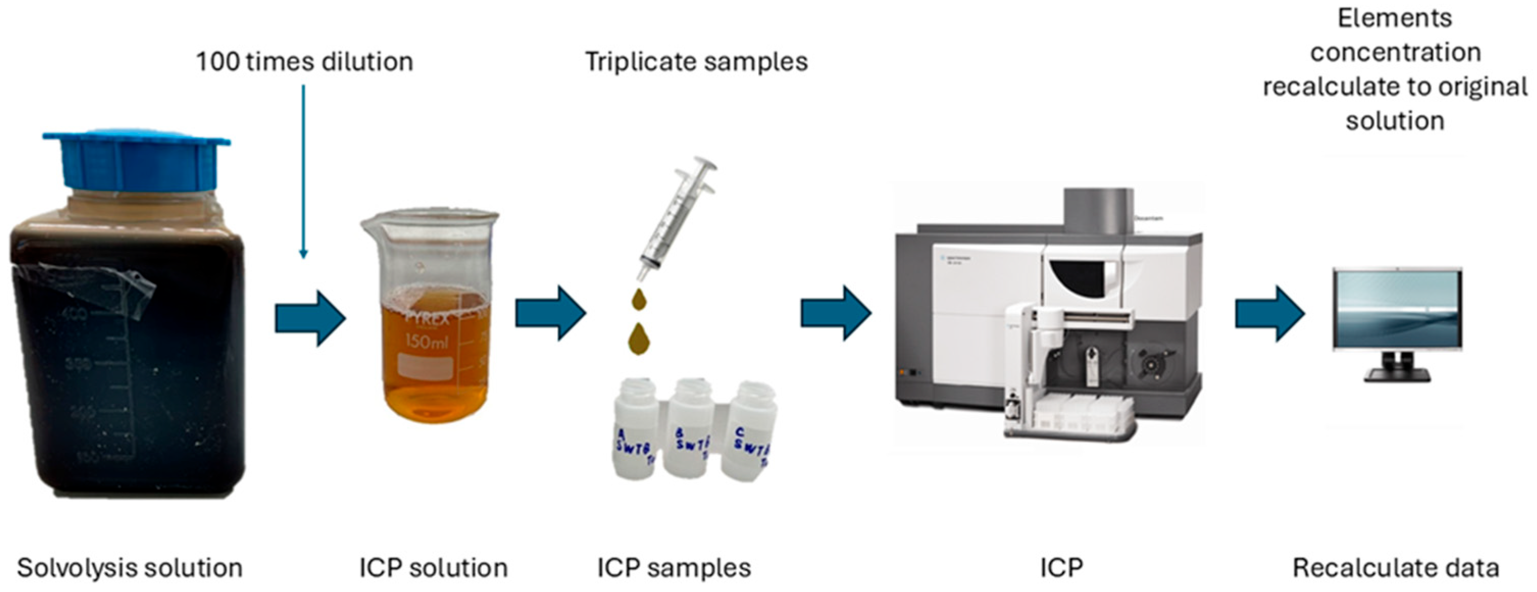 3.2.3. Elemental Composition of Solvolysis Wastes