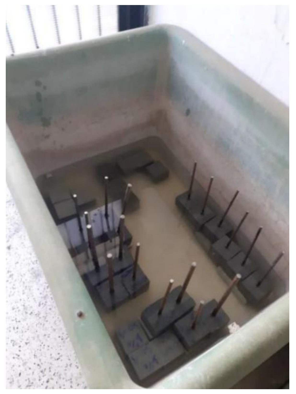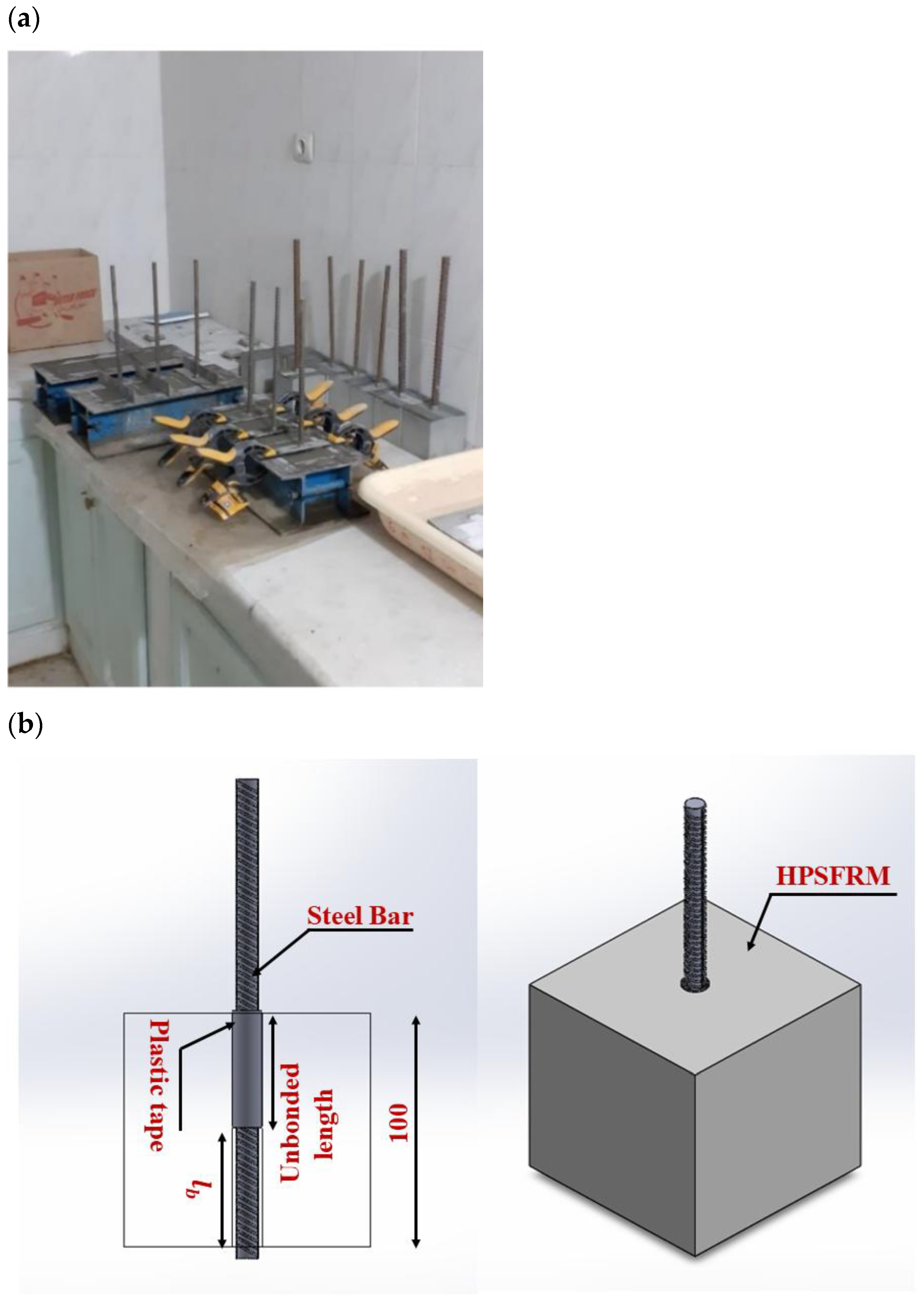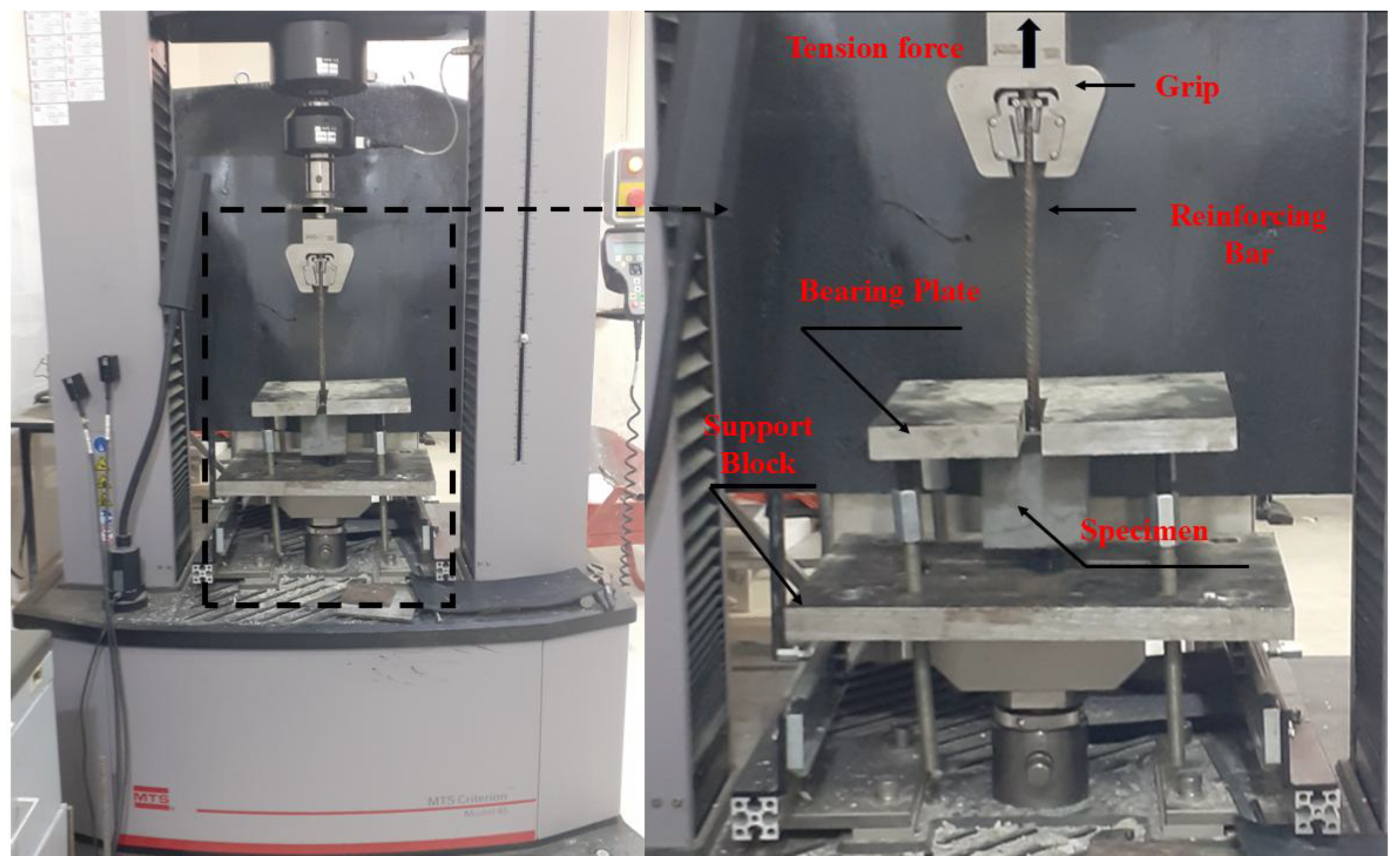 To assess the bonding interaction of ribbed steel bars in high-performance steel fiber-reinforced mortar, the results of the cube tests were utilized. Using the failure load obtained from the pull-out procedure, the bond strength was computed via division of this load by the surface area of the rebar’s bonded length, as defined by Equation (1):