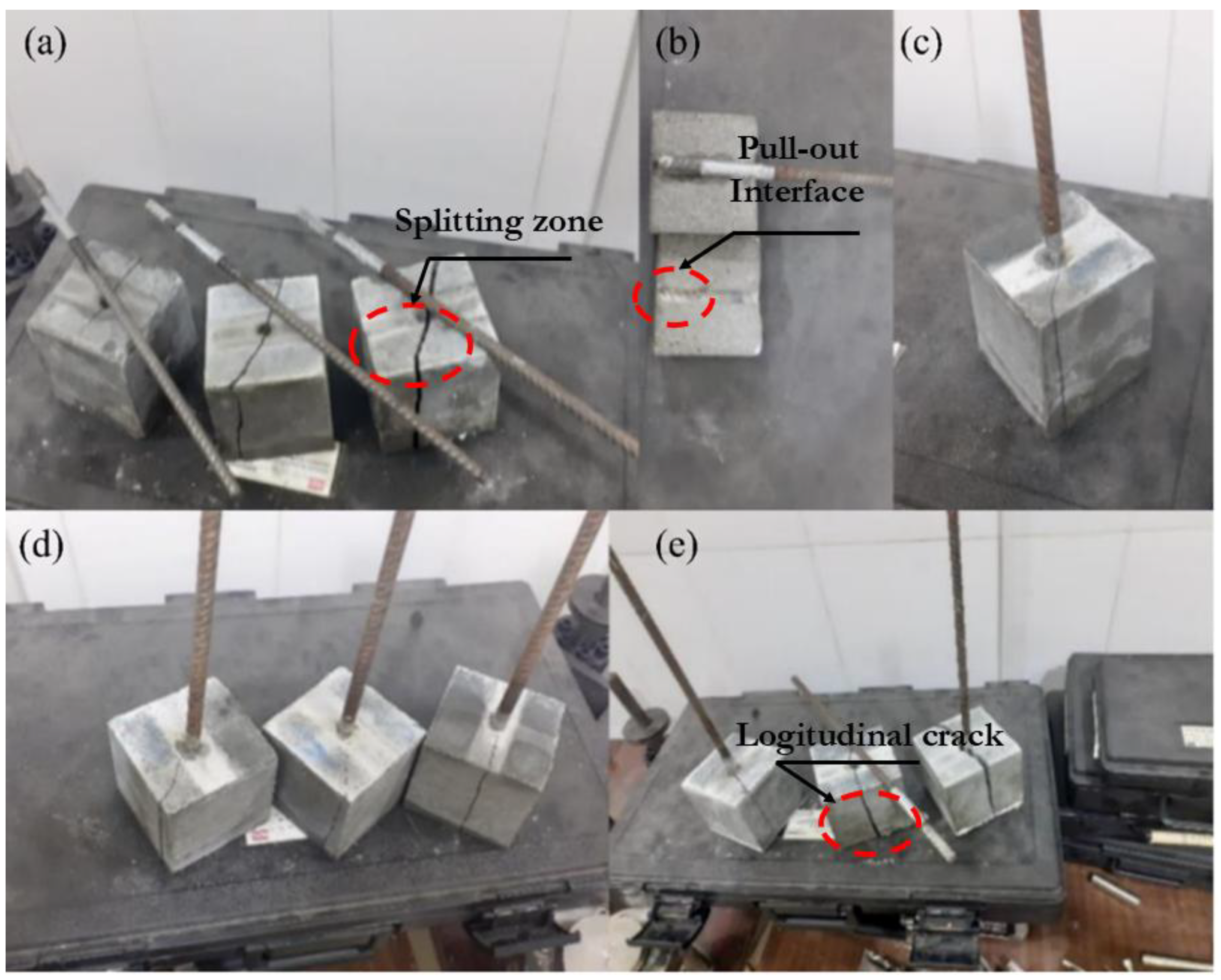 Figure 9b. The presence of fibers counteracted this effect by bridging across cracks generated by radial stresses, effectively redistributing stresses and delaying splitting. Consequently, the failure transitioned from pure splitting to a mixed pull-out–splitting mode, in which pull-out mechanisms contributed more significantly to the overall bond behavior. Owing to this bridging action, the concrete maintained structural integrity even after visible cracking.
