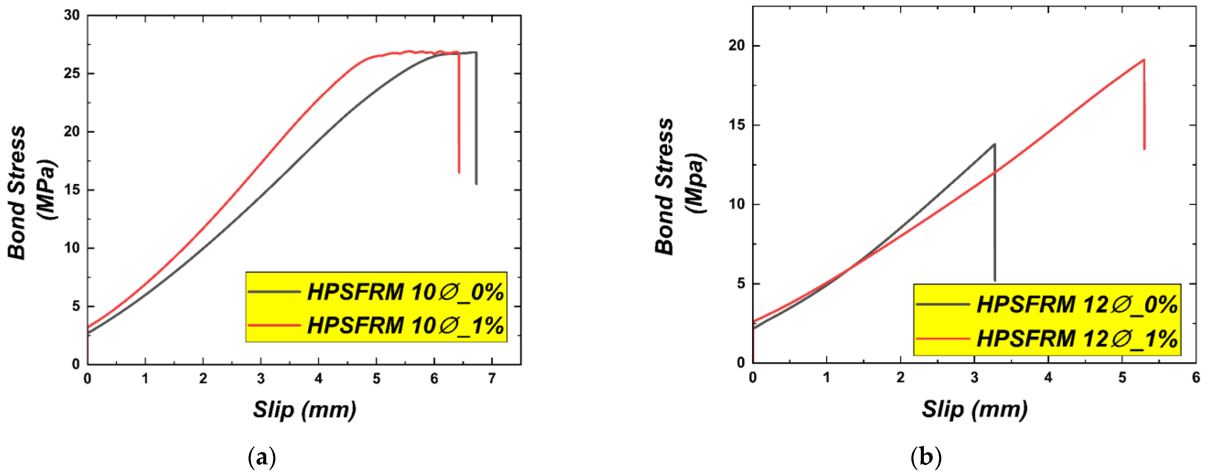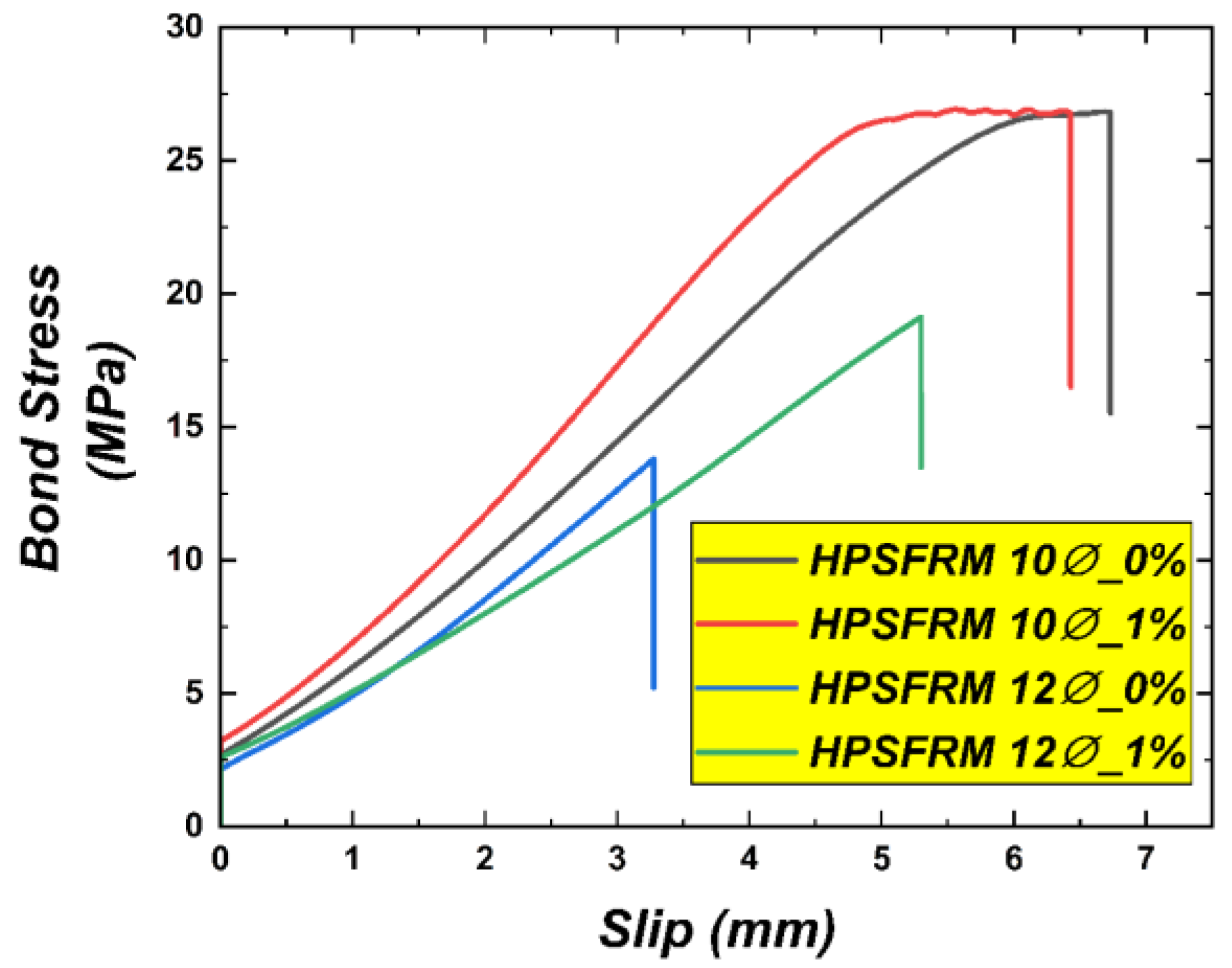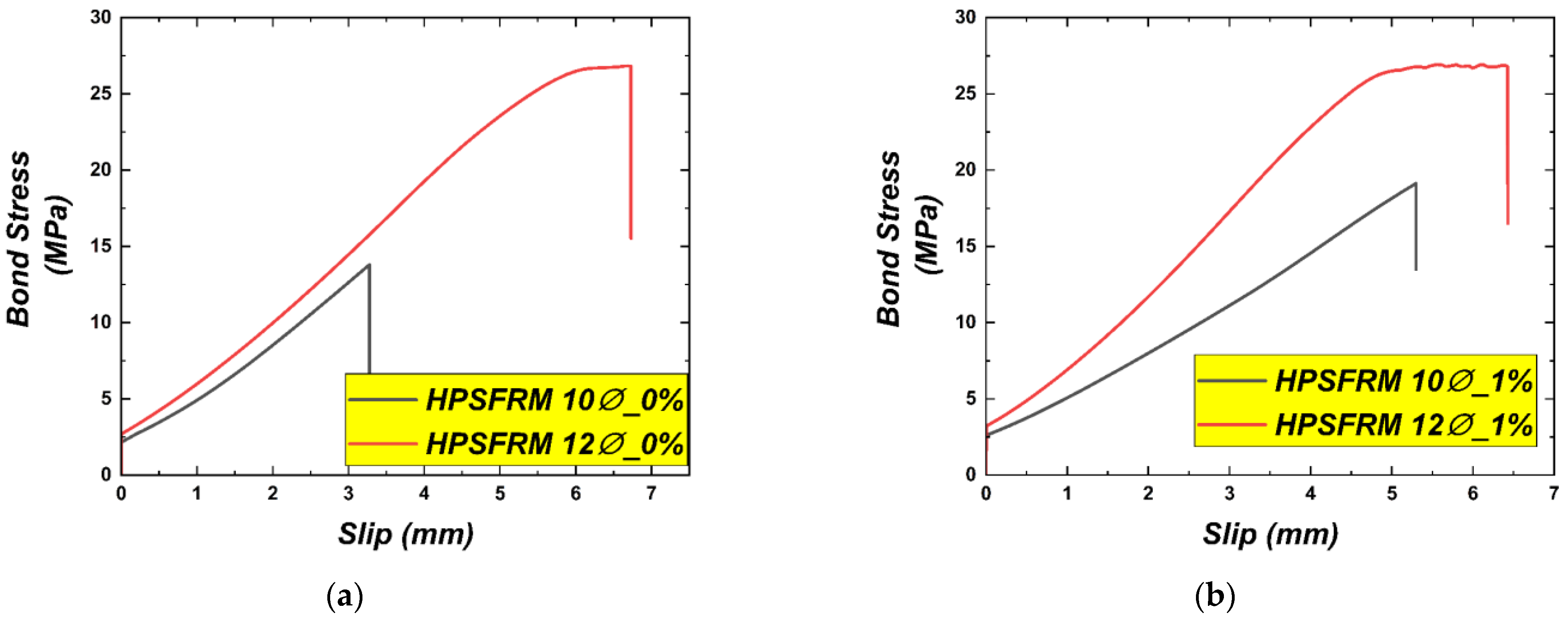 Typically, the interaction between deformed bars and HPSFRM is evidenced by the measured bond stress and corresponding slip. The average bond stress-slip responses for two different diameters are depicted in