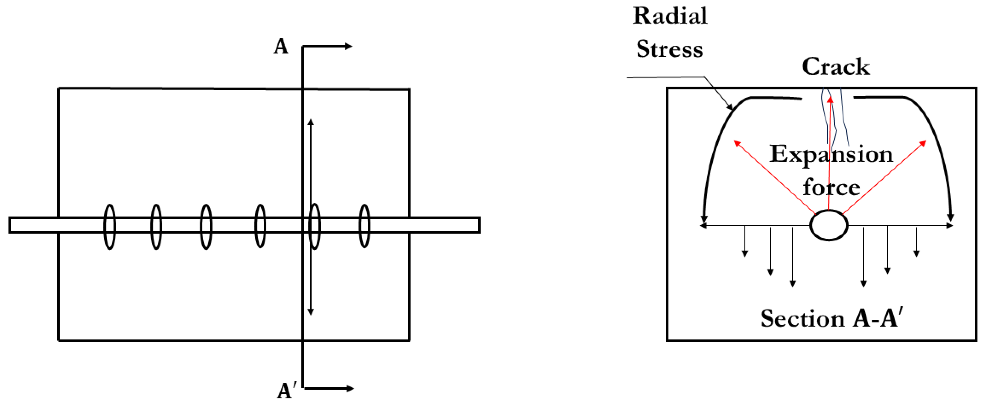 Figure 9. When the rebar is subjected to high loads, a significant crack often forms in the surrounding mortar, causing it to detach from the rebar. As the rebar transmits force via rib bearing, tensile stresses develop, which can lead to longitudinal splitting cracks or simultaneous splitting and pull-out failure. Due to the confinement offered by the mortar cover or additional contributing elements, Longitudinal cracks can induce splitting in the confining mortar medium, leading to a sharp drop in bond stress. Such bond failure is known as splitting failure [