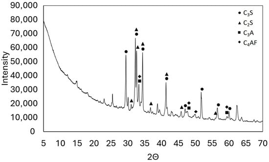 The chemical composition of the cement was determined by X-ray fluorescence (XRF) and loss on ignition (LOI), as presented in Table 1. Based on these values, the mineral composition of the cement was calculated using Bogue’s equations. The values obtained are 67.97, 6.51, 9.00, and 7.51 for C3S, C2S, C3A, and C4AF, respectively. XRD diffractogram is shown in Figure 3, while the Blaine method (ASTM C204 [42]) determined a specific surface area (fineness) of 2670.46 cm2/g for the cement used.