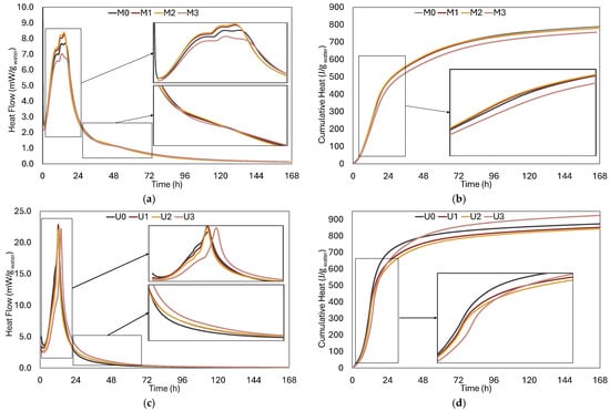 Heat flow and cumulative heat for (a,b) M and (c,d) U mixtures.