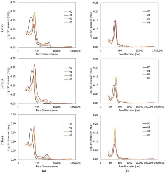First derivative of the cumulative pore volume results for (a) M and (b) U mixtures.