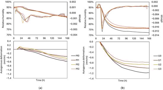 Autogenous shrinkage and internal relative humidity with first derivative in time for (a) M and (b) U mixture.