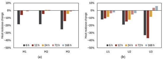 Heat release change in relation to the reference for (a) M and (b) U mixtures.