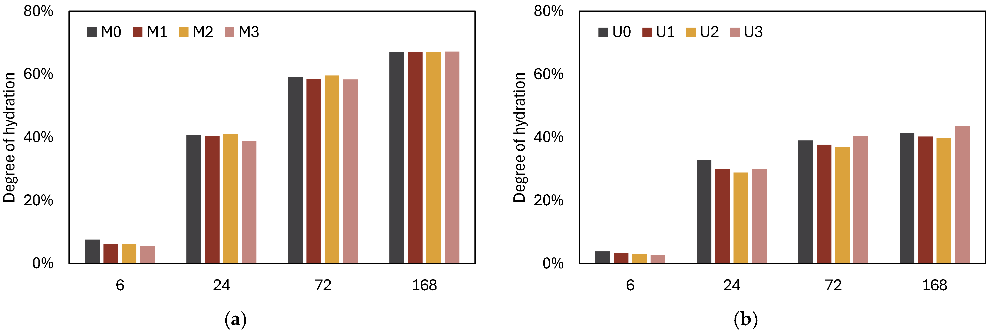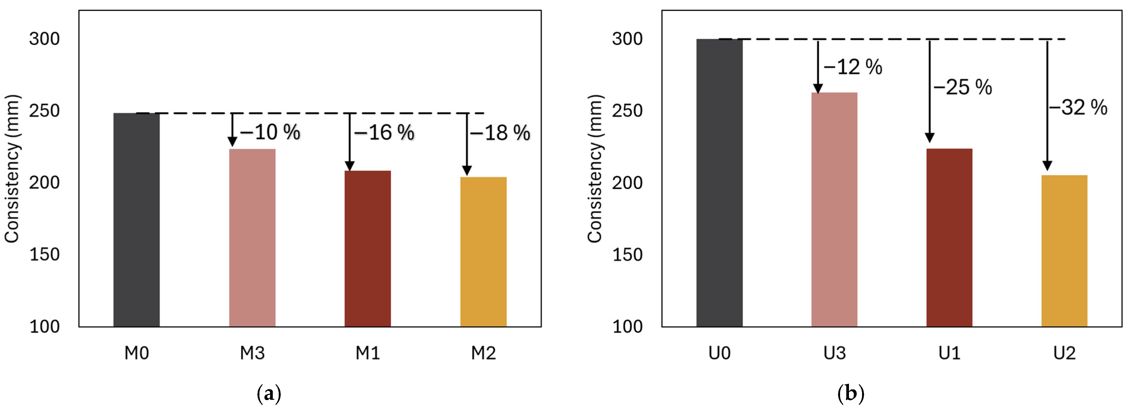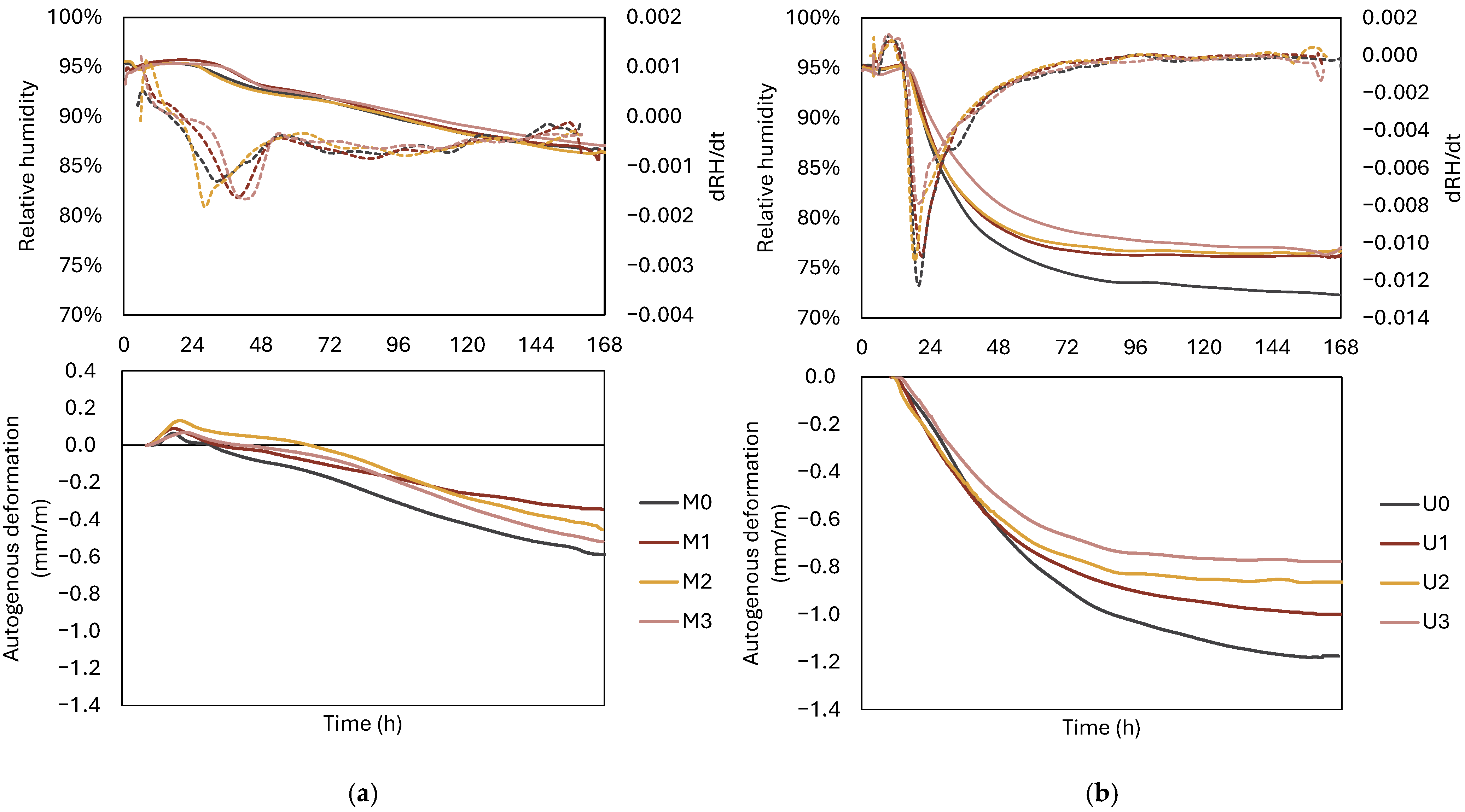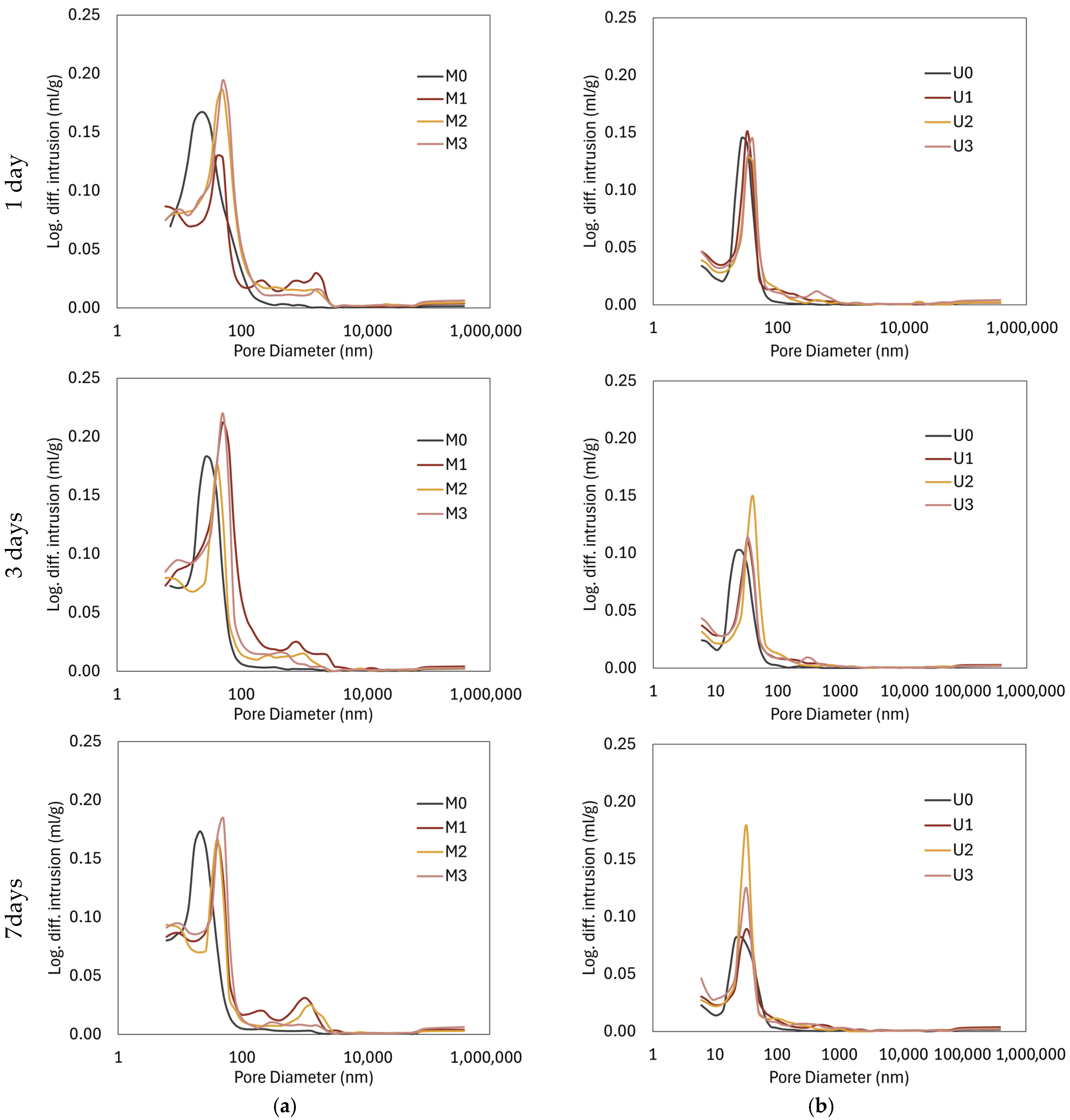 - Strength reductions are modest—up to ~16% at 28 days for M mixtures and below 10% for U mixtures—and correlate with increased porosity and coarser pores, not with fundamental changes in bulk hydration. All U mixtures still achieve compressive strengths above 100 MPa at 28 days.