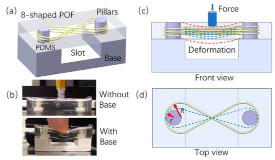 The sensor consists of two pillars, a piece of optical fiber, a PDMS package, and a base with a rectangle slot which is shown in Figure 1a. The base is 50 mm long and 30 mm wide. The sensor can be regarded as a polymer-based intelligent composite material. Two pillars with screw threads are fixed on the base. Both have a radius of 2.5 mm. The optical fiber is wound in 8-shaped rings between the two pillars. All of them are packaged by a PDMS matrix. Because of the rectangular slot between the sensor and the base, the soft PDMS sensor can deform under pressure, as shown in Figure 1c. The pillar is made of Polytetrafluoroethylene (PTFE), which has an elastic modulus higher than that of PDMS by two orders of magnitude. When the PDMS layer is pressed by a force, the pillars can be regarded as rigid cylinders and can keep straight. The composite material between the two pillars can be regarded as a beam fixed at the two ends. When the PDMS moves down, the optical fiber embedded in the PDMS moves synchronously. From the front view of the sensor in Figure 1c, the optical fiber bends from a straight line to a curve (blue line), and thus its length increases a lot. From the top view, as shown in Figure 1d, the two ends of the 8-shaped ring are fixed by two pillars and cannot move. The increasing length of the optical fiber in the front view must result in the shrinkage of the 8-shaped ring in the top view. As shown in Figure 1d, the radius of the 8-shaped ring decreases from R (yellow curve) to r (blue curve) as the force applied on the top surface increases. When light propagates in the optical fiber, the output intensity of light is influenced by the bending loss of the fiber. Thus, the sensor can detect the contact force according to the bending loss of the POF. The 8-shaped structure converts the deformation from the vertical plane to the horizontal plane. Comparing to the traditional micro-bending sensor, the proposed sensor detects the macro-bending loss and can sustain a larger deformation. The excellent flexibility of the proposed sensors can be seen from Figure 1b.