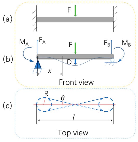 (a) A schematic diagram of the mechanical model of the sensor; (b) Mechanical model of the sensor when ignoring the horizontal reaction force; (c) Geometrical model of the sensor.